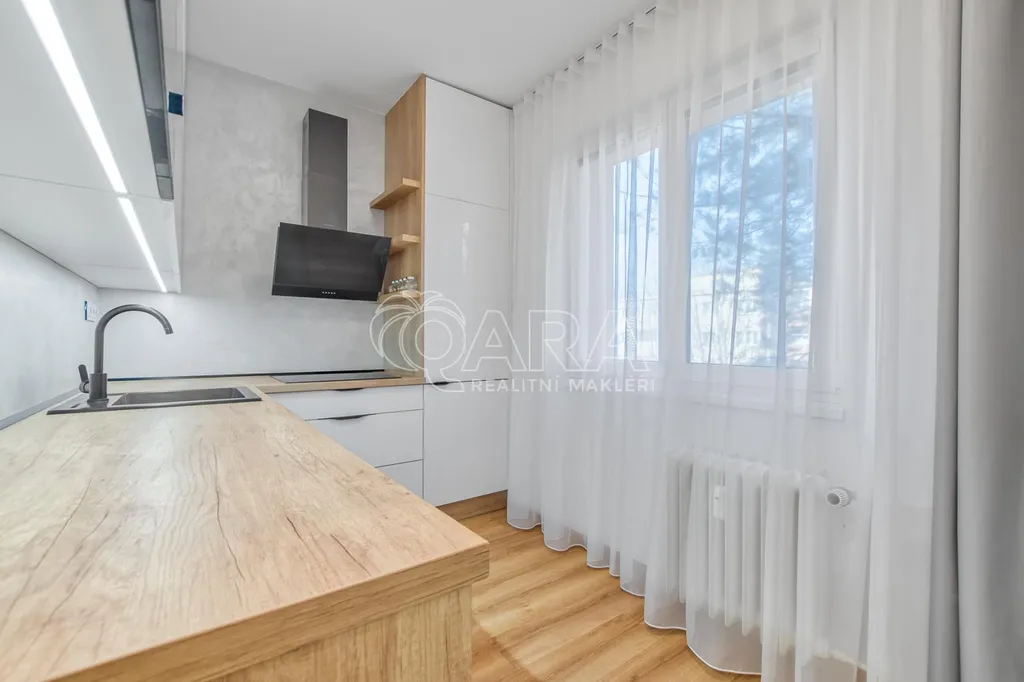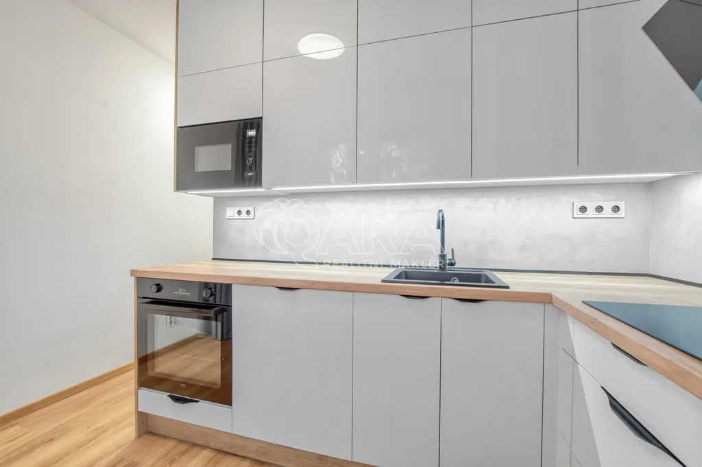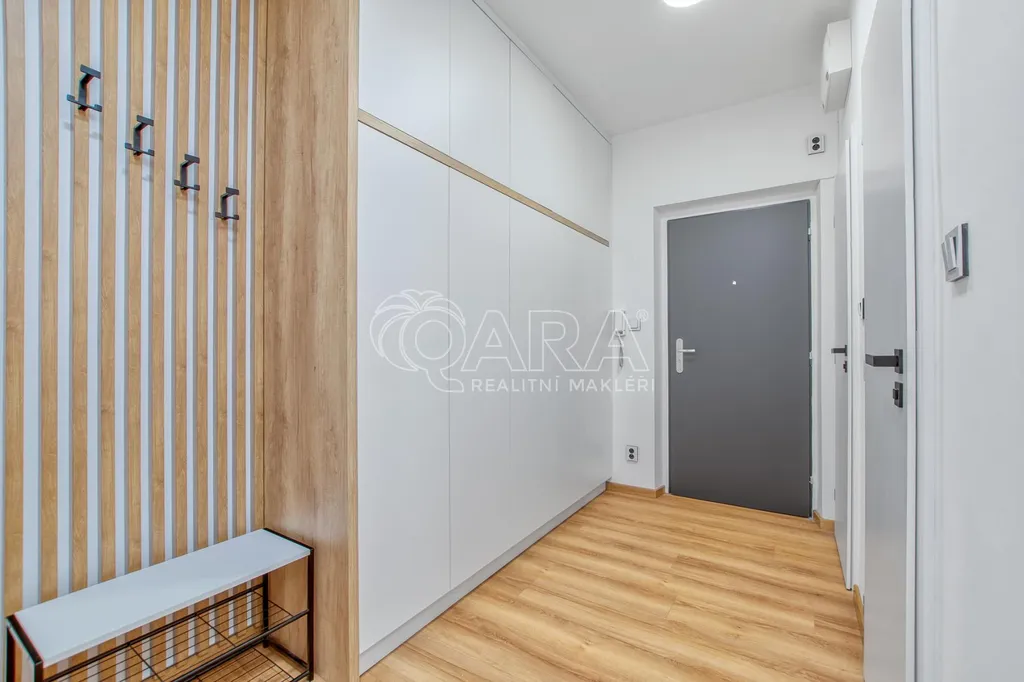 Kuchyňská linka byla vyrobena na míru až ke stropu, aby maximálně využila prostor pro ukládání věcí. Její součástí jsou kvalitní vestavné spotřebiče včetně lednice s mrazákem, myčky, trouby a mikrovlnné trouby. Vaření zajišťuje moderní indukční deska s digestoří. Další úložné prostory nabízí vestavná skříň na chodbě a sklep, který k bytu náleží.