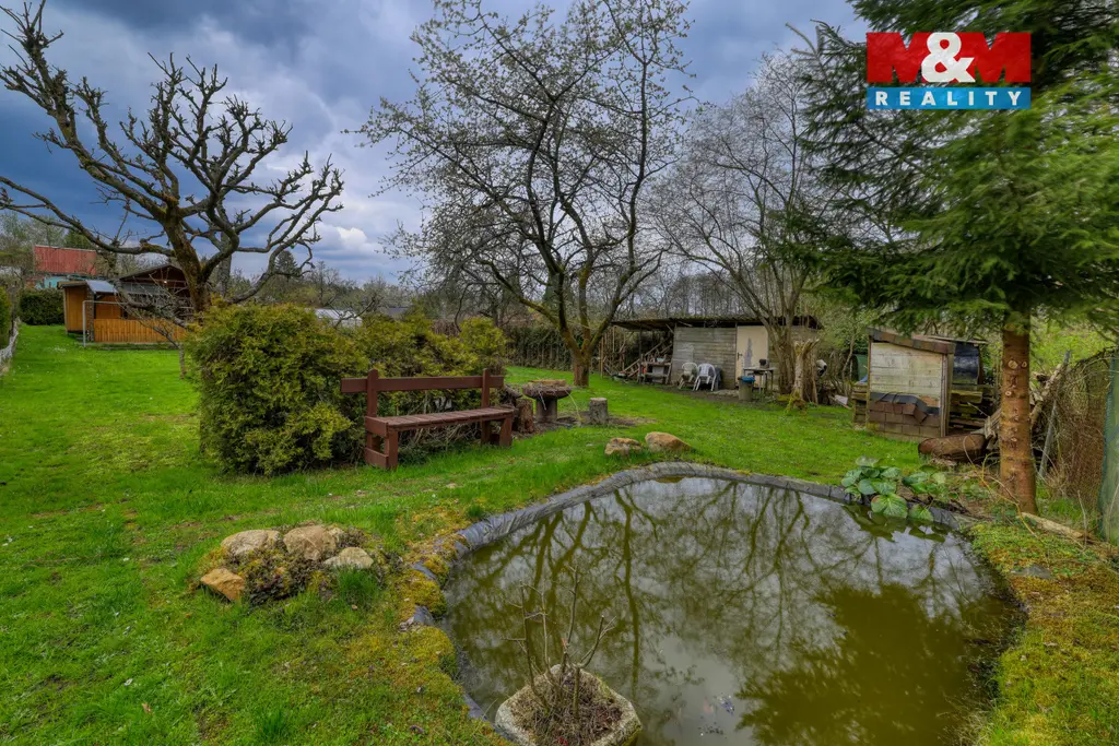 Součástí je udržovaný rohový pozemek o rozloze 597 m² se vzrostlými ovocnými stromy, jezírkem, ohništěm, skleníkem (20 m²) a pergolou (5,6 m²). K dispozici je také kůlna s dřevníkem a nářadím.