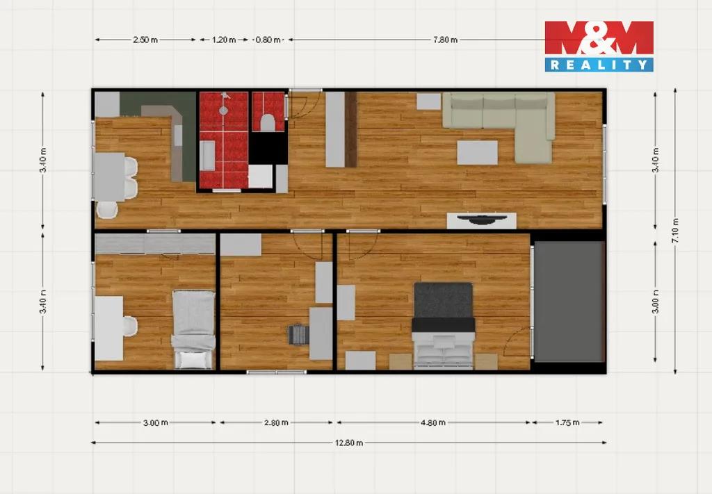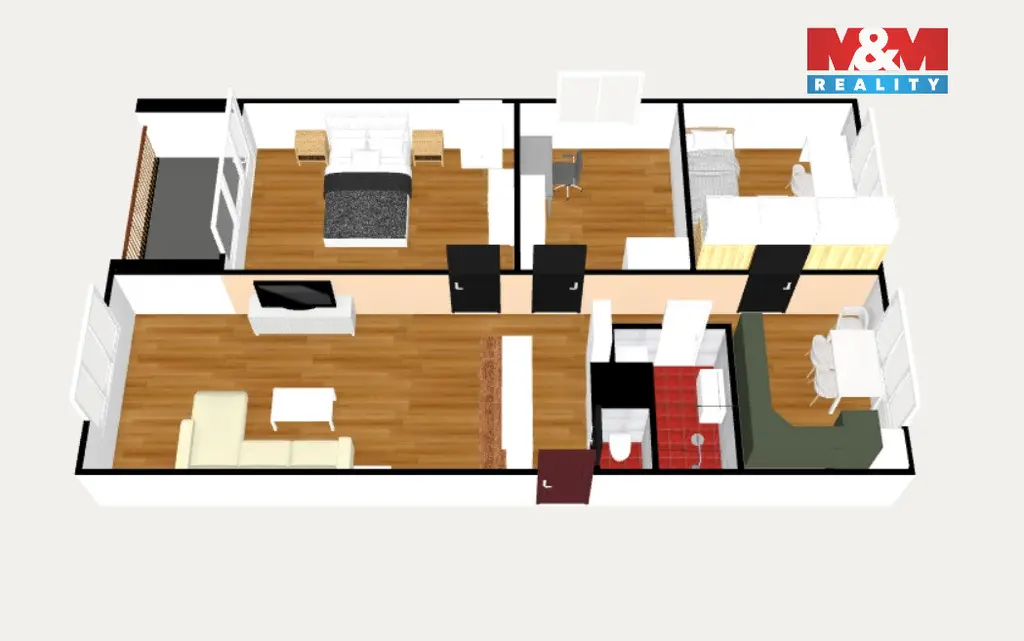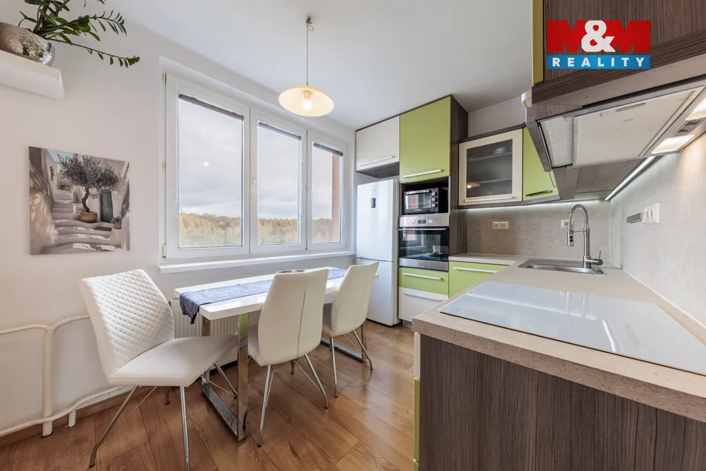Byt prošel kompletní rekonstrukcí a působí vzdušně. Předsíň plynule navazuje na velký obývací pokoj, který tvoří srdce bytu. Kuchyně nabízí moderní linku i jídelní kout. Nechybí ložnice s lodžií, dětský pokoj a menší místnost vhodná jako pracovna či šatna.