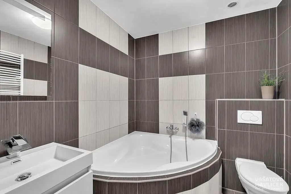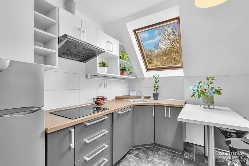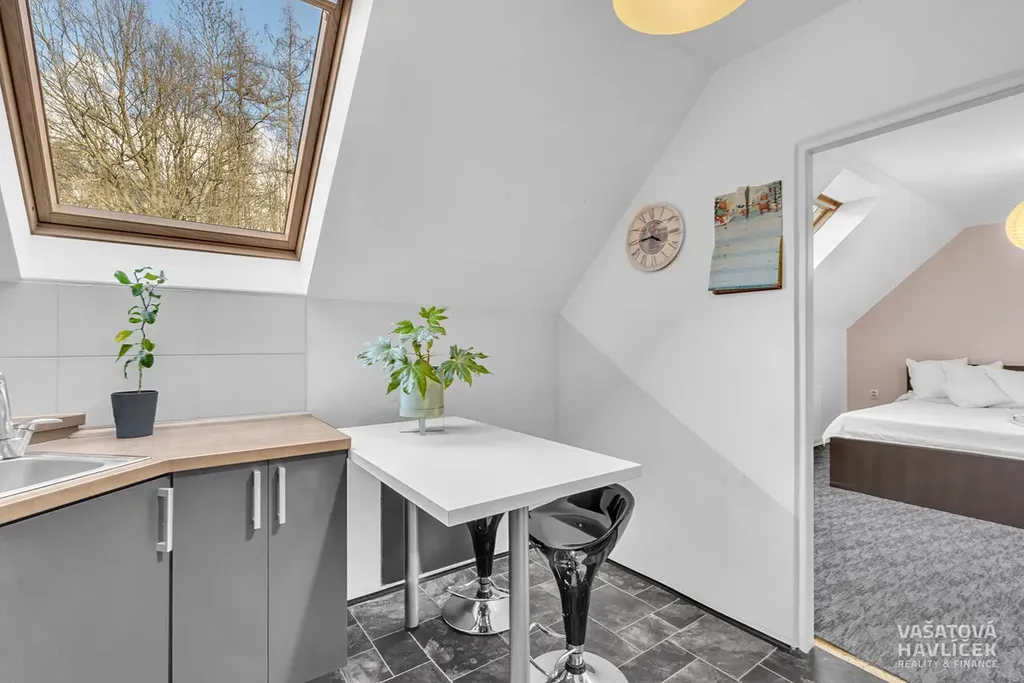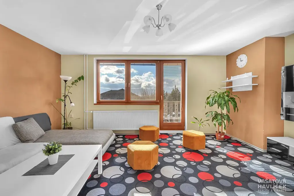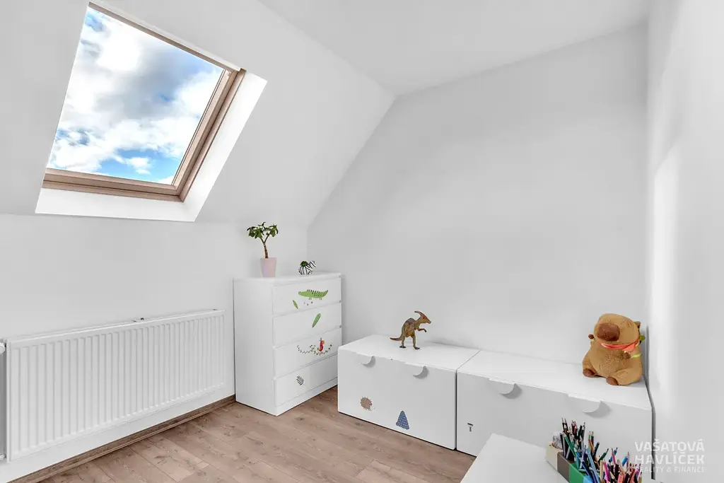 Byt 5+1 (cca 90 m²) v podkroví: chodba, komora, kuchyň, koupelna s WC, obývací pokoj s balkónem, tři pokoje.