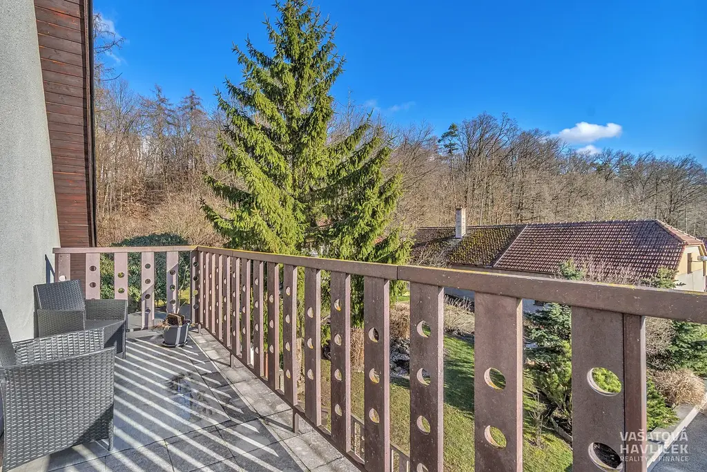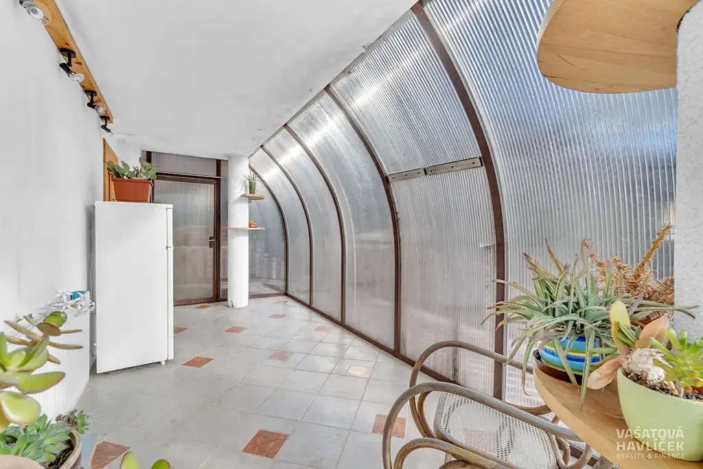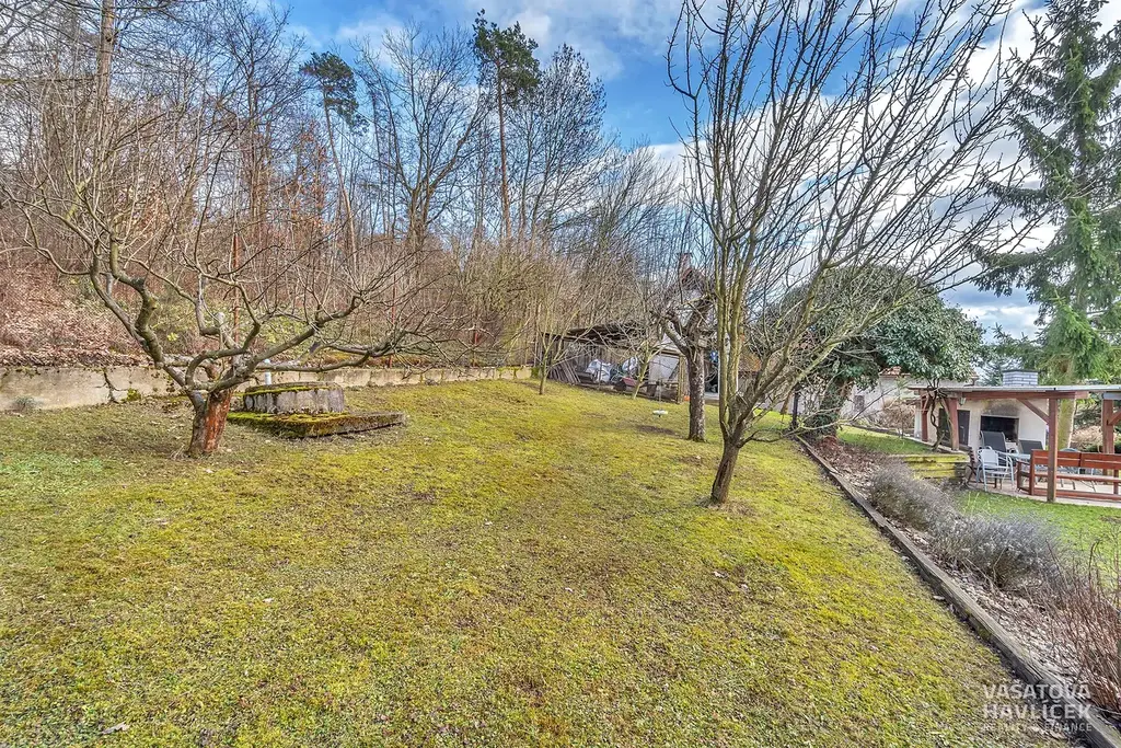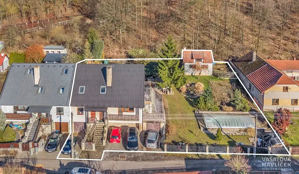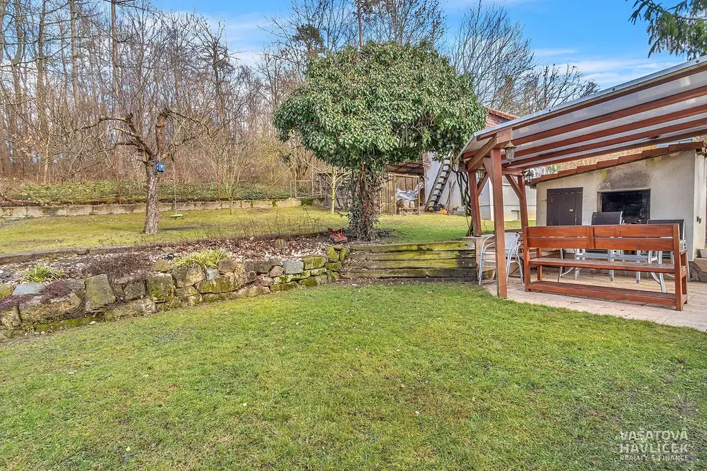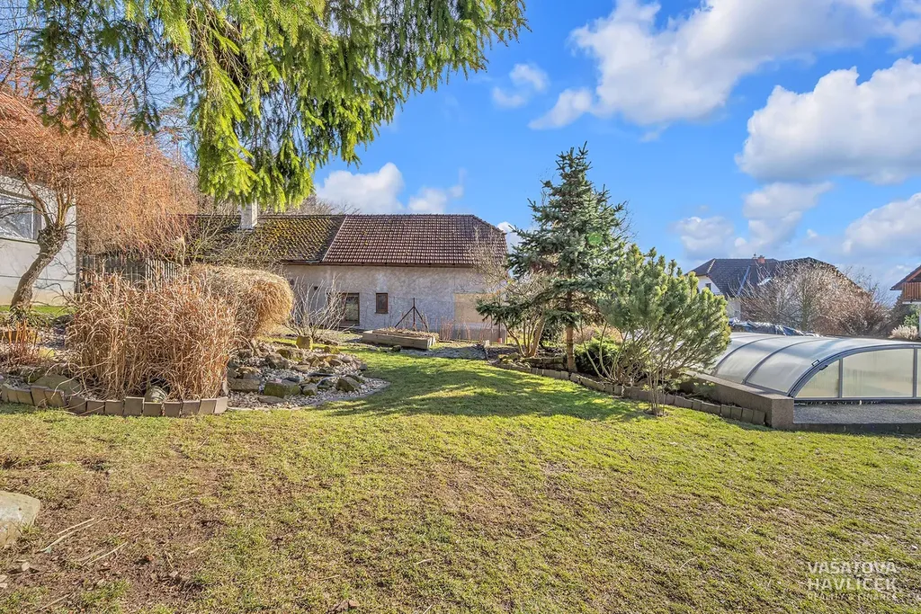 Na pozemku o výměře 1 222 m² se kromě domu nachází další technické zázemí. Okrasná zahrada vytváří místo pro posezení pod pergolou, nechybí krb, udírna ani krytý bazén s osvětlením. Zahrada je doplněna o užitkovou část s ovocnými stromy, keři a kopanou studnou (12 m) pro zalévání. Na dům navazuje garáž (24 m²) a terasa se zimní zahradou. Ta umožňuje samostatný vstup do bytu v 1. NP. Z venku je dále vchod do sklepa. Před domem se je vydlážděná plocha s možností parkování.
