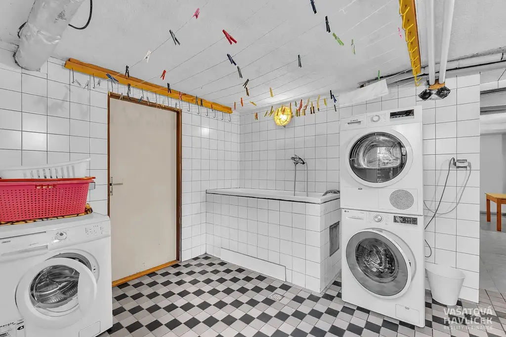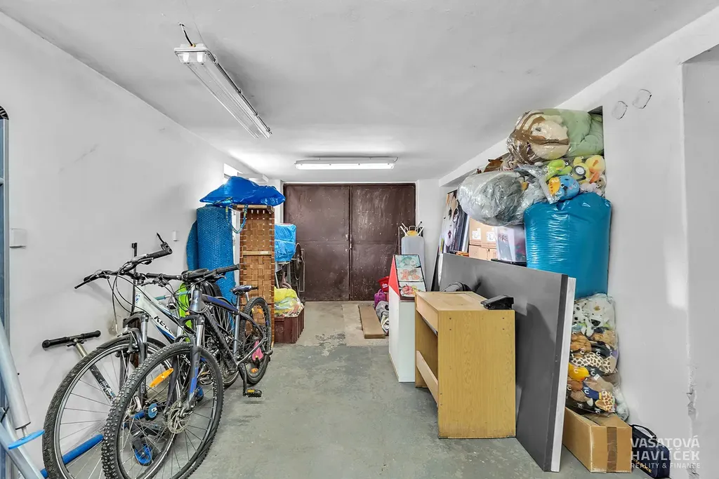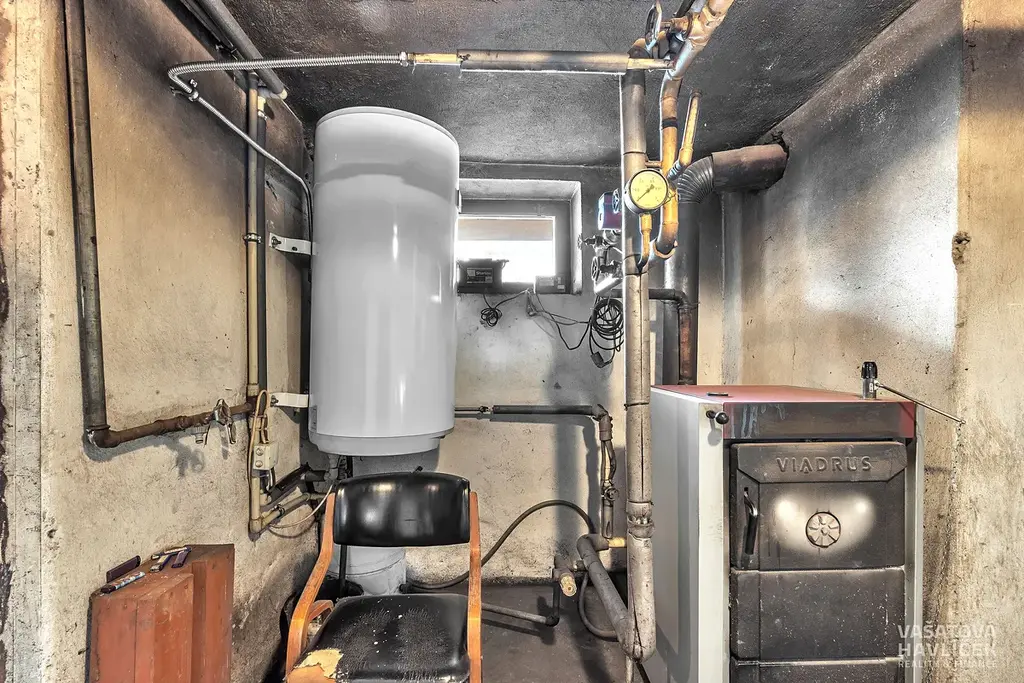 Suterén (cca 90,9 m²): prádelna, kotelna, dva sklepy, dílna a garáž.