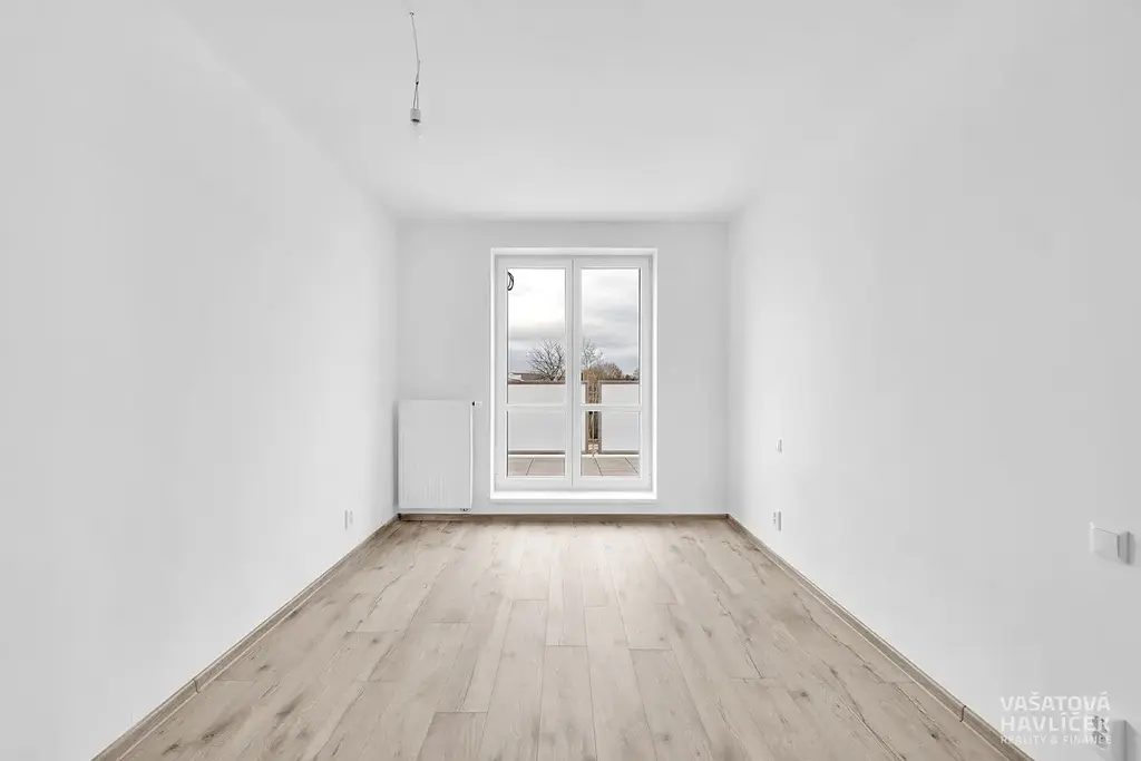 Dispozice bytu: obývací pokoj s velkou terasou (30 m²) je orientován na jih a je řešen velkoformátovým prosklením; ložnice, dětský pokoj a menší terasa (10 m²) jsou orientovány na východ. V bytě je nainstalovaná nová kuchyňská linka, indukční varná deska, digestoř Mora a trouba Mora. Koupelna je vybavena vanou, umyvadlem, prostorem pro pračku a žebříkovým radiátorem. Byt má úložné prostory, které lze využít jako šatnu, komoru příp. pracovnu. V obytných pokojích je vinylová podlaha, v chodbě a koupelně je položena dlažba. Součástí prodeje může být po vzájemné dohodě také vybrané vybavení bytu. Topení a ohřev vody zajišťuje domovní plynový kotel s centrální přípravou teplé užitkové vody.