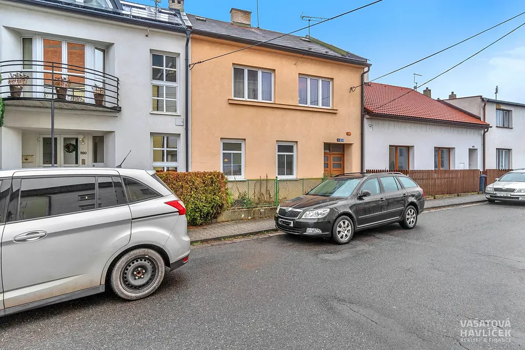 Přední dvoupodlažní dům z roku 1932 nabízí 149 m² podlahové plochy. Stavba je ze smíšeného zdiva (opuka, kámen) a střechu kryje eternit. Do ulice směřují plastová okna s dvojsklem, do zahrady pak původní špaletová. Interiér tvoří trámové stropy a dřevěné podlahy v obou podlažích, v kuchyni je linoleum a na chodbách i koupelně dlažba. Dům je delší dobu neobývaný, přesto je v dobrém technickém stavu.