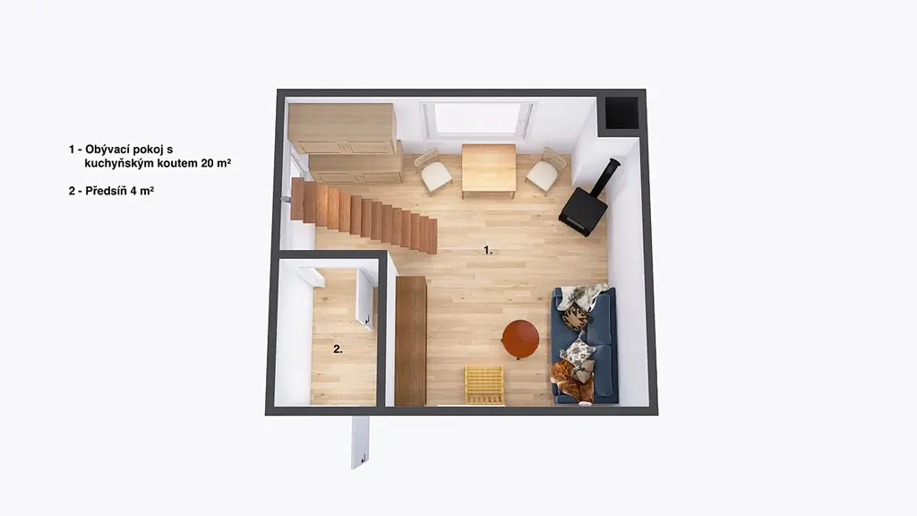 Chata nabízí jednoduché, ale pohodlné zázemí pro odpočinek a trávení času venku. Má dvě podlaží a dispozice je 2+kk s užitnou plochou 48 m². Okolní prostředí nabízí klid, čerstvý vzduch a jen pár metrů od chaty krásné výhledy na rybník a ikonický vrch Zebín.