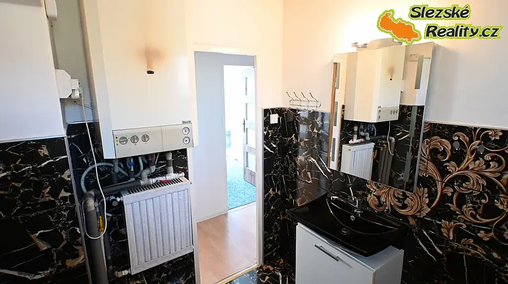 vytápění zajišťuje nástěnný plynový kotel Therm a krbová litinová kamna