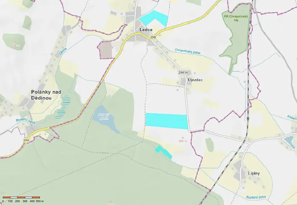 Prodávané parcely číslo 533/2, 533/17, 533/25, 534, 704, 858 v katastrálním území Ledce vedené na listu vlastnictví číslo 44 mají společnou výměru 158.003 m2.