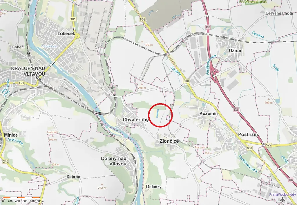 Pozemek se nachází v lokalitě U Křížku, východně od obce Chvatěruby a severně od obce Zlončice, s přímým přístupem z obecní komunikace. Vzdálenost 1 km od silnice II/608 a 2 km od dálnice D8 zajišťuje rychlé napojení na Mělník, Prahu i další regiony. Kombinace klidného venkovského prostředí a výborné dopravní dostupnosti zvyšuje atraktivitu pozemku jak pro investici, tak pro případné budoucí využití.