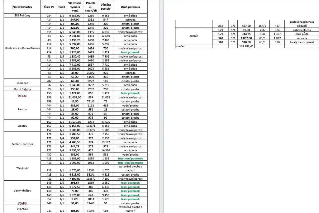 Celková výměra nabízených pozemků činí 145 881,4 m² a zahrnuje různé druhy zemědělských ploch – orná půda, trvalé travní porosty, lesní pozemky a další. Nemovitosti se nacházejí na více katastrálních územích a jsou evidovány na několika listech vlastnictví.