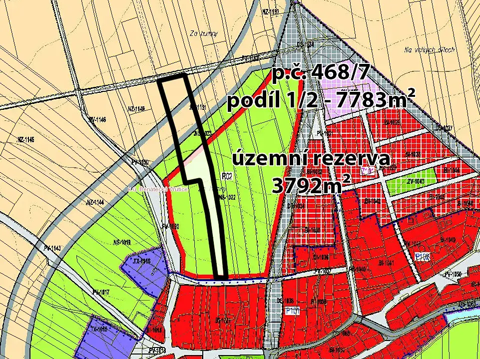 Nabízíme k prodeji poloviční podíl na pozemcích p.č. 468/7 a p.č. 468/16, o celkové výměře 10.693 m2. Jedná se o územní rezervu pro bydlení v rodinných domech severozápadně od zástavby Benátecké Vrutice. Pozemky mají dva přístupy, z jižní strany polní cesta navazující na asfaltovou komunikaci - vše ve vlastnictví obce a přístupné. Ze severní strany vede dlouhodobě užívaná polní cesta.