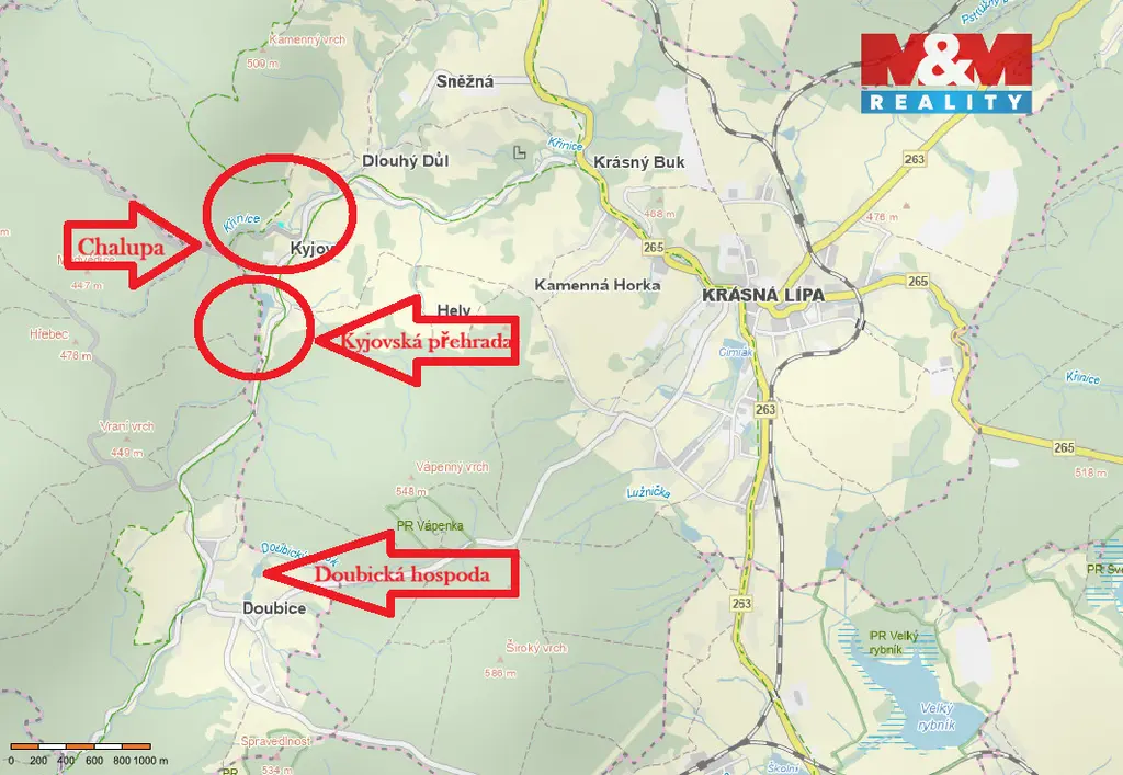 Hledáte klidné místo, pohodu a klid uprostřed krásné přírody, tak právě Vám nabízíme k prodeji chalupu v katastru Kyjova u Krásné Lípy v části obce Dlouhý Důl. Dispozice 4+KK je rozložena do IIINP. V INP obývací pokoj s krbovými kamny a kuchyňským koutem. Koupelna se sprchovým koutem a samostatné WC. Dřevěné schodiště do patra kde jsou 3 pokoje. Malý sklep se vstupem v chodbě pod schodištěm. Dominantou chalupy, která je na LV zapsaná jako stavba pro rodinnou rekreaci a má své č. ev. 72 je rozsáhlá zahrada o CP 1046 m². Objekt byl postaven v minulosti společně s majiteli sousední chalupy, ale každá nemovitost má svá popisná čísla a soukromí, díky uspořádání pozemků okolo nemovitosti. Na zahradě vlastní vrt s pitnou vodou. Ideální k rekreaci, případně k celoročnímu bydlení pro milovníky klidu a přírody. V docházkové vzdálenosti možnost koupání v Kyjovské přehradě a ve 2km vzdálené Doubici vyhlášená Doubická hospůdka a další přírodní krásy v okolí. Budu se těšit s Vámi na prohlídce.