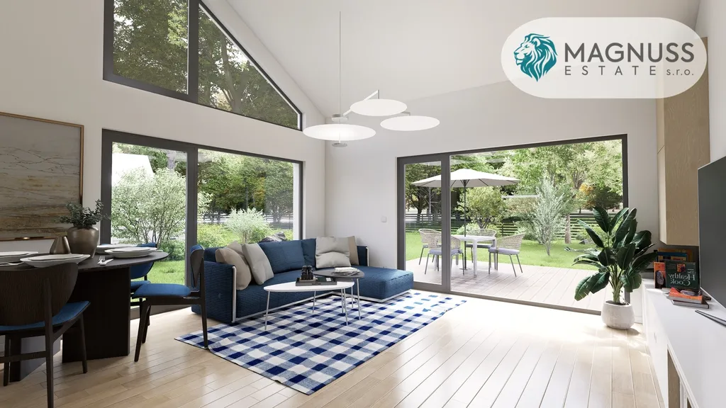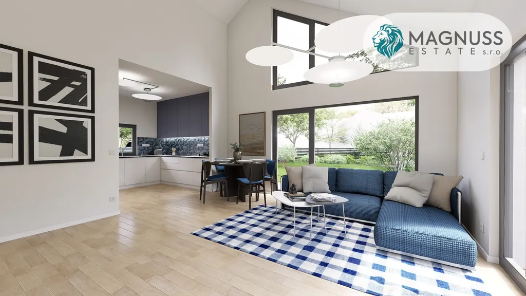Interiér klade důraz na vzdušnost, dostatek denního světla a plynulé propojení se zahradou. Velkoformátová okna a otevřený obytný prostor přirozeně navazují na terasu, čímž vytvářejí ideální prostředí pro každodenní život i setkávání s rodinou a přáteli. Otevřený strop navíc podtrhuje pocit prostoru a čistotu architektury.