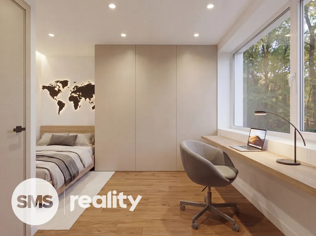 Patro (2. NP): Klidová zóna. Dva samostatné dětské pokoje a hlavní ložnice se soukromou průchozí šatnou a místem navrženým pro kosmetický stolek u okna. Na patře se nachází velkorysá koupelna vybavená vanou i sprchovým koutem (Walk-in).