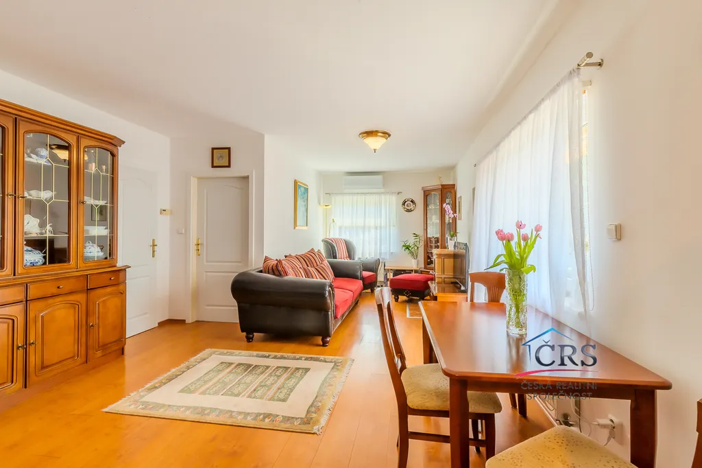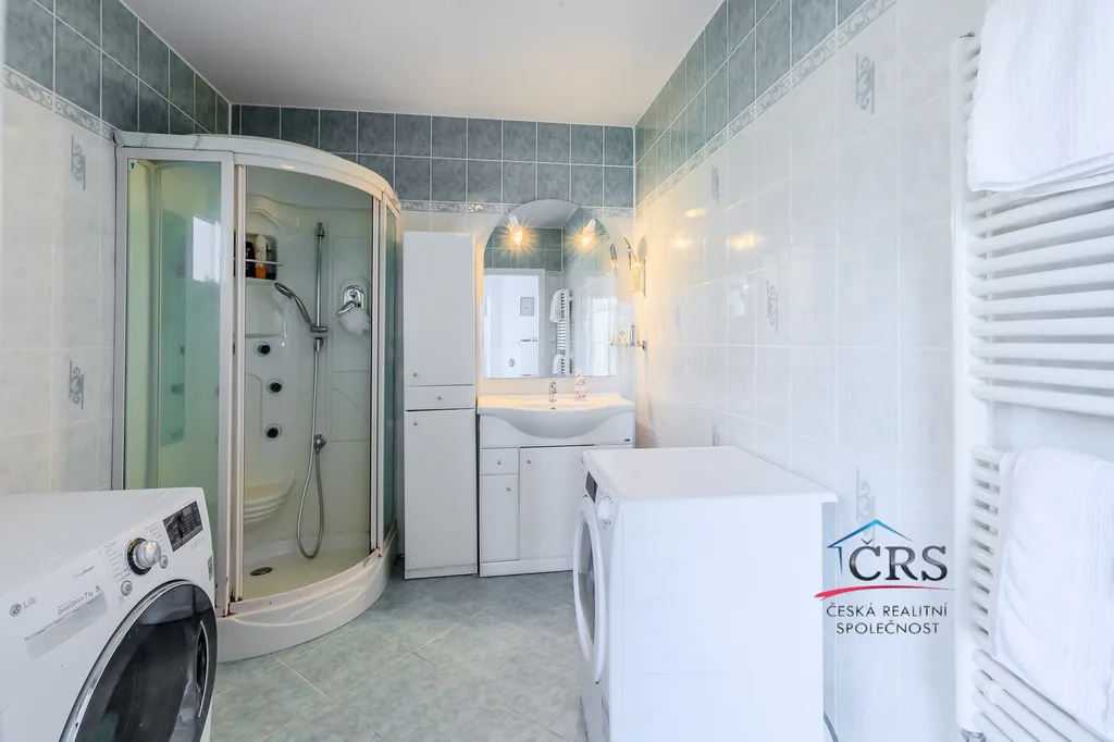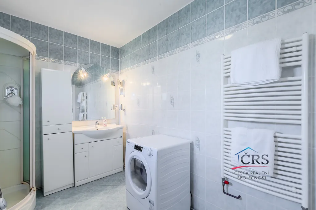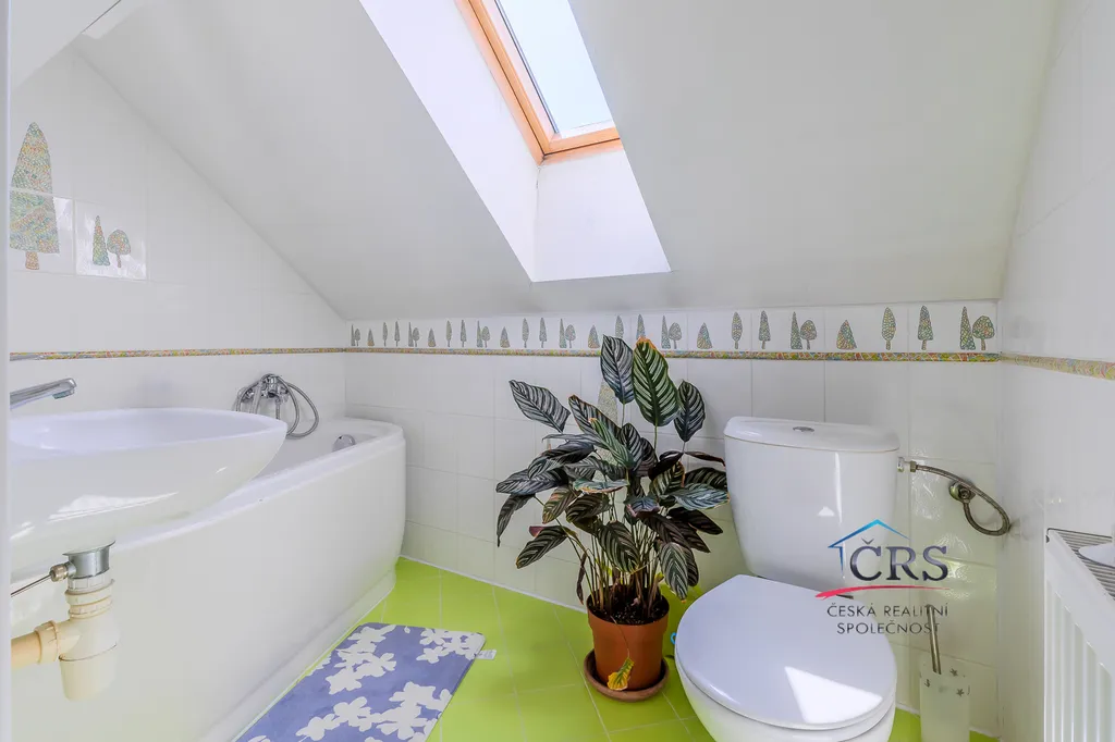 Na podlahách naleznete kombinaci plovoucí podlahy, dlažby a koberců, což přispívá k pohodlí i praktickému využití jednotlivých místností.