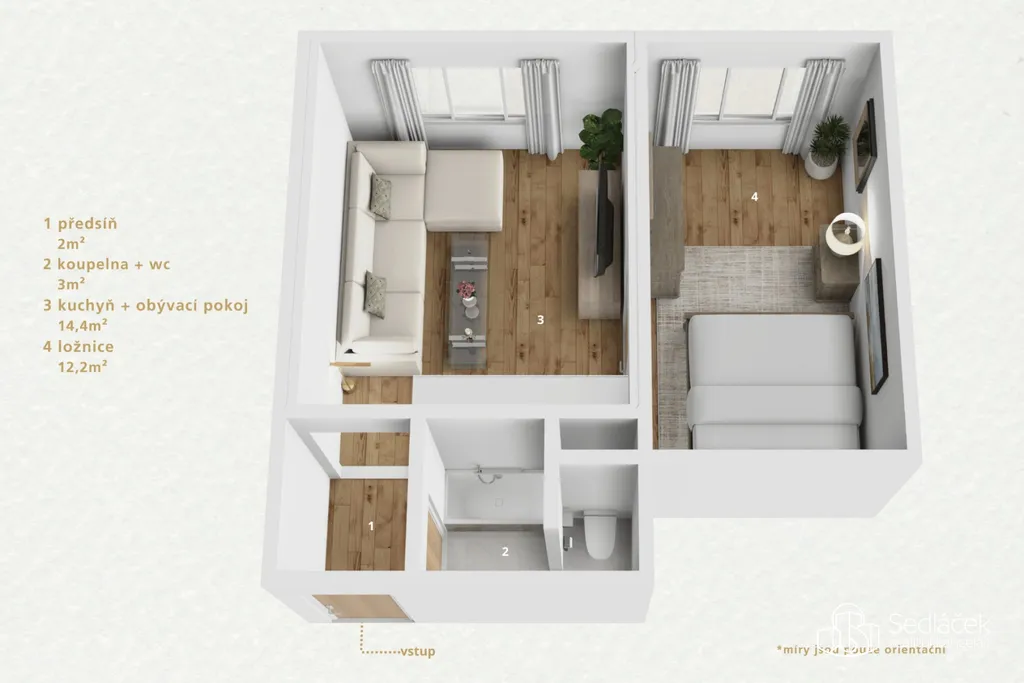 Dispozici bytu tvoří kuchyně propojená s obývacím prostorem, samostatná ložnice, koupelna s vanou a toaletou. Plastová okna zajišťují dobrou tepelnou i zvukovou izolaci. K bytu náleží dvě sklepní kóje, které poskytují dostatek úložného prostoru.