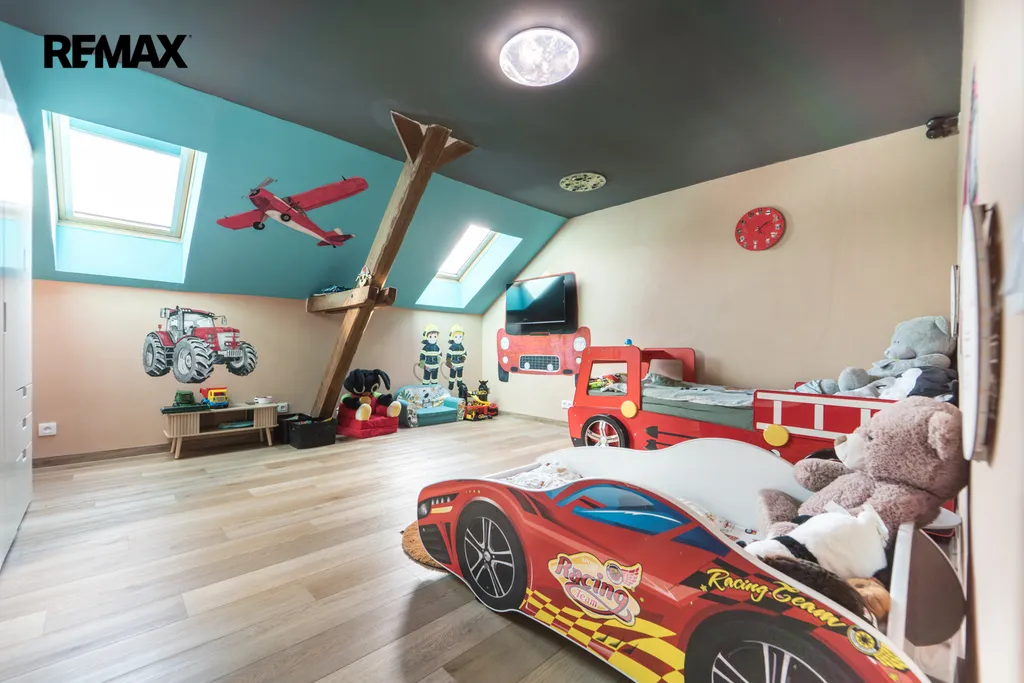 Dům nabízí podlahovou plochu přes 200 m². Dispozice je řešena velmi prakticky – v přízemí se nachází prostorný obývací pokoj s kuchyňským koutem a místem na hraní pro děti a posezením u krbu, koupelna, pracovna, technická místnost a velká vstupní hala. V podkroví pak najdete tři samostatné pokoje (jeden dětský pokoj a dvě ložnice) a druhou koupelnu (se sprchovým koutem i vanou), což zajišťuje dostatek soukromí pro celou rodinu. Druhá polovina podkroví může být využita pro dokončení dalších případných obytných prostor.