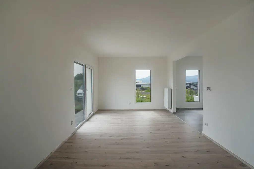 Obytná dispozice je řešena prakticky, kdy v přízemí naleznete vstupní předsíň, která je samostatně oddělena od veškerých dalších místností v domě a je zde prostor na velký botník, z předsíně je vstup do obývacího pokoje, který je vzdušně otevřený do velkého prostoru, kdy je plynule spojený s jídelnou a kuchyní s dostatkem pracovních ploch. Přízemí dále nabízí samostatnou technickou místnost, koupelnu se sprchovým koutem, toaletou a umyvadlo. Schodištěm se dostaneme do chodby v prvním poschodí, kde se nabízí tři ložnice, prostorná koupelna s vanou a toaletou. Moderní design a světlé interiéry Vám poskytnou pocit lehkosti a prostornosti, který si zamilujete. S nízkoenergetickým vytápěním pomocí tepelného čerpadla v kombinaci s radiátory ve veškerých prostorách domu nejen ušetříte na energii a finančních nákladech, ale také přispějete k ochraně životního prostředí. Soukromá zahrada domu představuje ideální místo k odpočinku, setkávání s rodinou a přáteli nebo pěstování rostlin a zeleně.