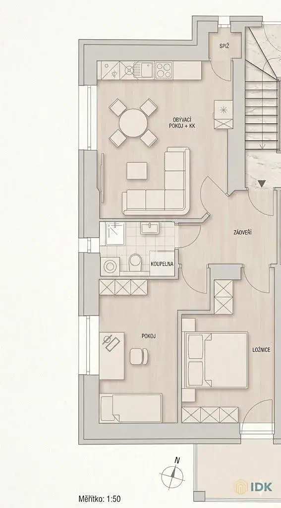 Centrem bytu je obývací pokoj s kuchyňským koutem, který poskytuje dostatek prostoru pro jídelní část i pohodlné sezení. Na kuchyň navazuje také malá spíž, ideální pro uložení potravin nebo domácích potřeb.