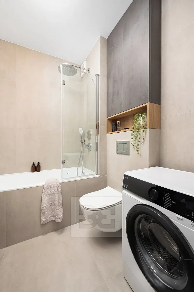 Samostatná ložnice je vybavena nábytkem na míru, který nabízí dostatek úložných prostor. Koupelna zaujme moderním designem a kvalitním provedením – k dispozici je vana, umyvadlo a toaleta.