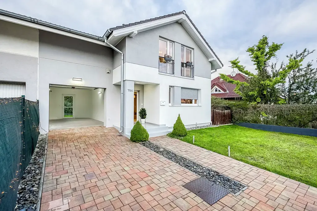 Dům nabízí komfortní dispozici 5+kk s dostatkem prostoru pro celou rodinu – prostorný obývací pokoj s přímým vstupem na zahradu, kuchyň s jídelním koutem, čtyři ložnice, koupelna, dvě toalety, technické zázemí a garáž.