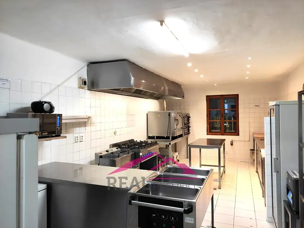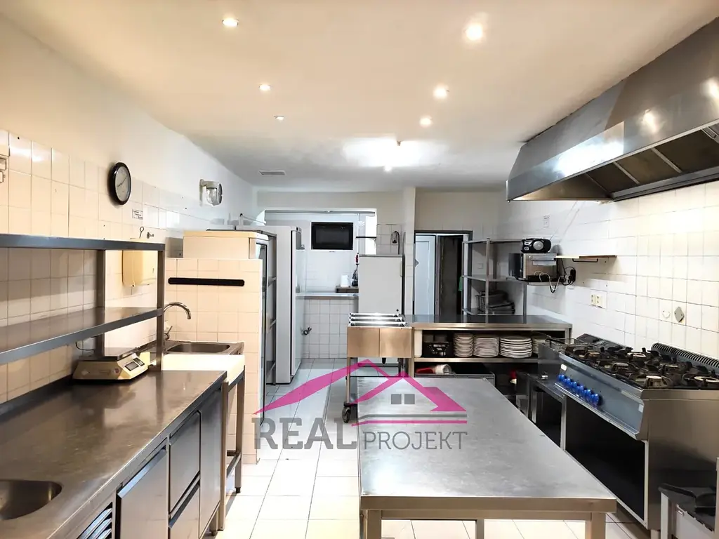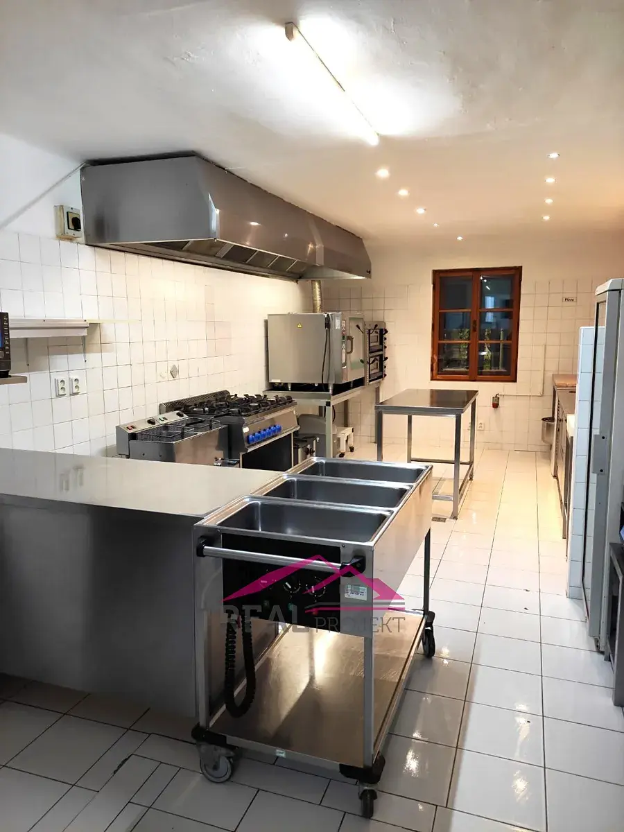 velká prostorná kuchyně, obsluhovaný úsek, bar, toalety, sklad, úklidová místnost, sociální zařízení, kancelář, malá předzahrádka, sklep: 17,4 m2, personální WC.