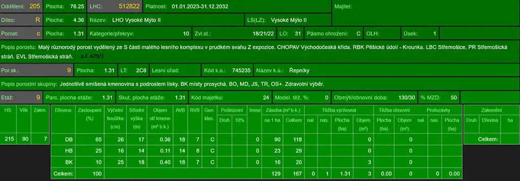 - p.č. 629/1 vedená jako lesní pozemek o celkové výměře 13 069 m2, z toho vlastníme podíl 3/8 tedy 4 901 m2 (stáří lesa 93 let - zastoupení dřevin dub, habr, buk).