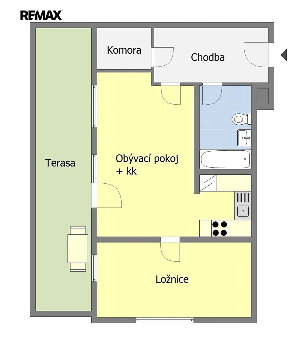 Byt 2kk (obývací pokoj, kuchyňský kout, ložnice, komora, koupelna s toaletou), terasa, parkovací místo.