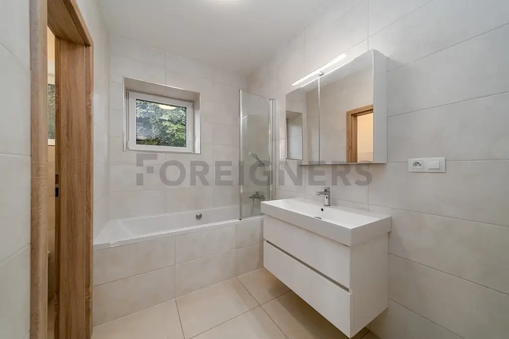 Koupelna s vanou, umyvadlem se skříňkou a zrcadlem, otopným žebříkem. Samostatnou toaletou a úklídovou místností s umyvadlem.