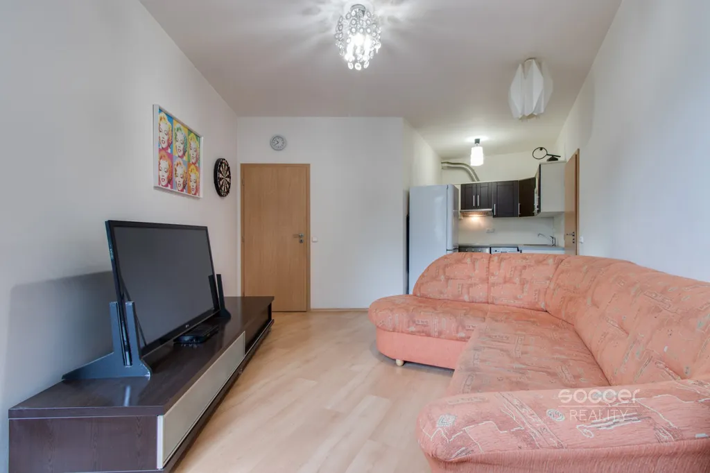 Interiér bytu se člení na chodbu, komoru, koupelnu s vanou a WC, obývací pokoj s kuchyňskou linkou a ložnici. Byt je vybaven kuchyňskou linkou včetně spotřebičů (el. varná deska, el. trouba, lednice s mrazákem, myčkou, digestoří s odtahem), TV stolkem, manželskou postelí, šatní skříní a komodou. Byt disponuje praktickou komorou s policovým systémem. V celém bytě jsou plovoucí podlahy, v koupelně je dlažba. Je zde možnost internetu a kabelové televize od více poskytovatelů.