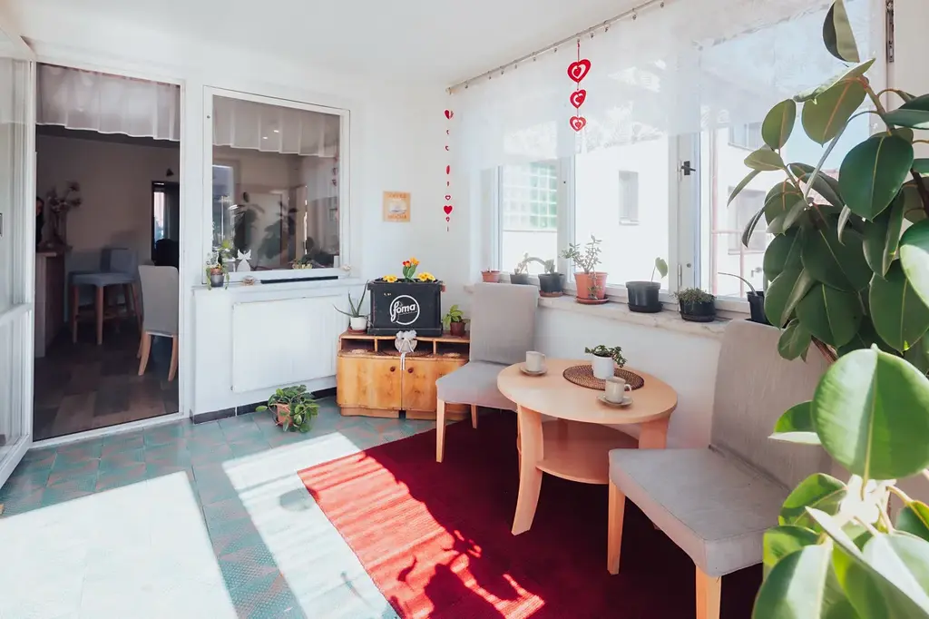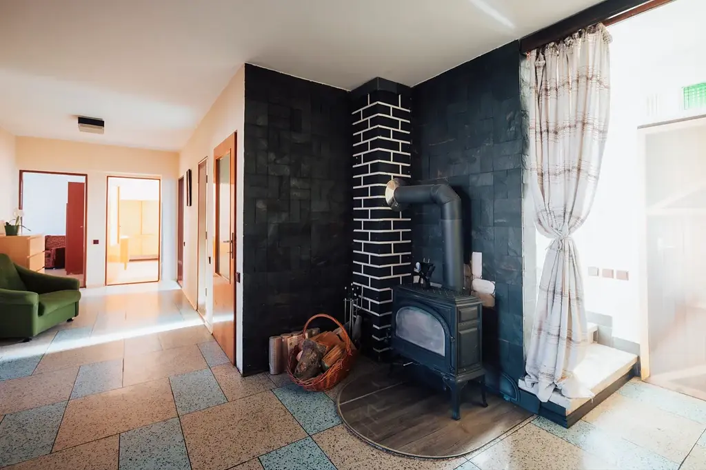 Dominantou domu je obytné podlaží s prostornou halou s krbovými kamny, obývacím pokojem a zimní zahradou s přímým vstupem na zahradu – ideální místo pro každodenní život i společné chvíle.