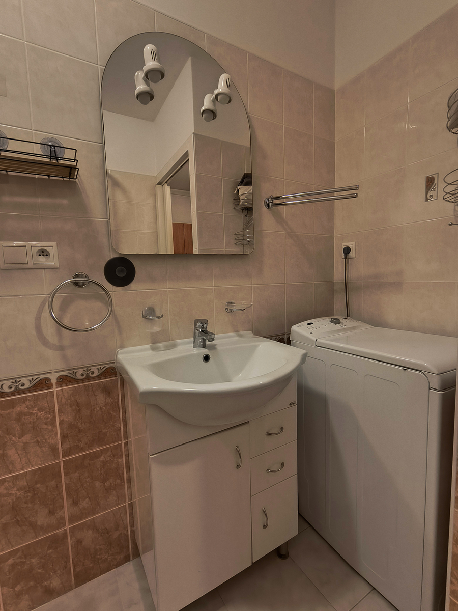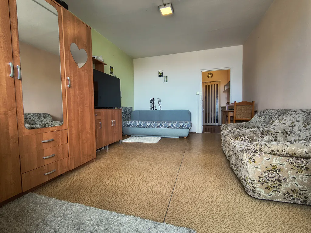 Dispozice bytu nabízí vstupní chodbu s dostatkem prostoru pro skříně, zděnou koupelnu se sprchovým koutem, toaletou, umyvadlem a prostorem pro pračku. Hlavní obytný prostor je řešen jako obývací pokoj s kuchyňským koutem a přímým vstupem na balkon, který poskytuje příjemný, ničím nerušený výhled. Byt se prodává včetně vybavení, což umožňuje okamžité využití bez dalších investic.