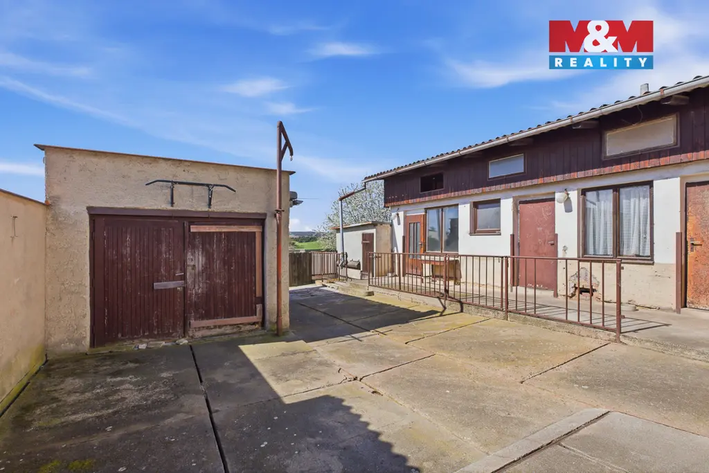 Na uzavřeném dvoře se nachází garáž, venkovní kuchyně, toaleta a také udírna, což nabízí příjemné zázemí pro rodinné posezení i praktické využití.
