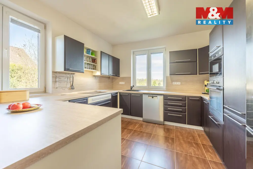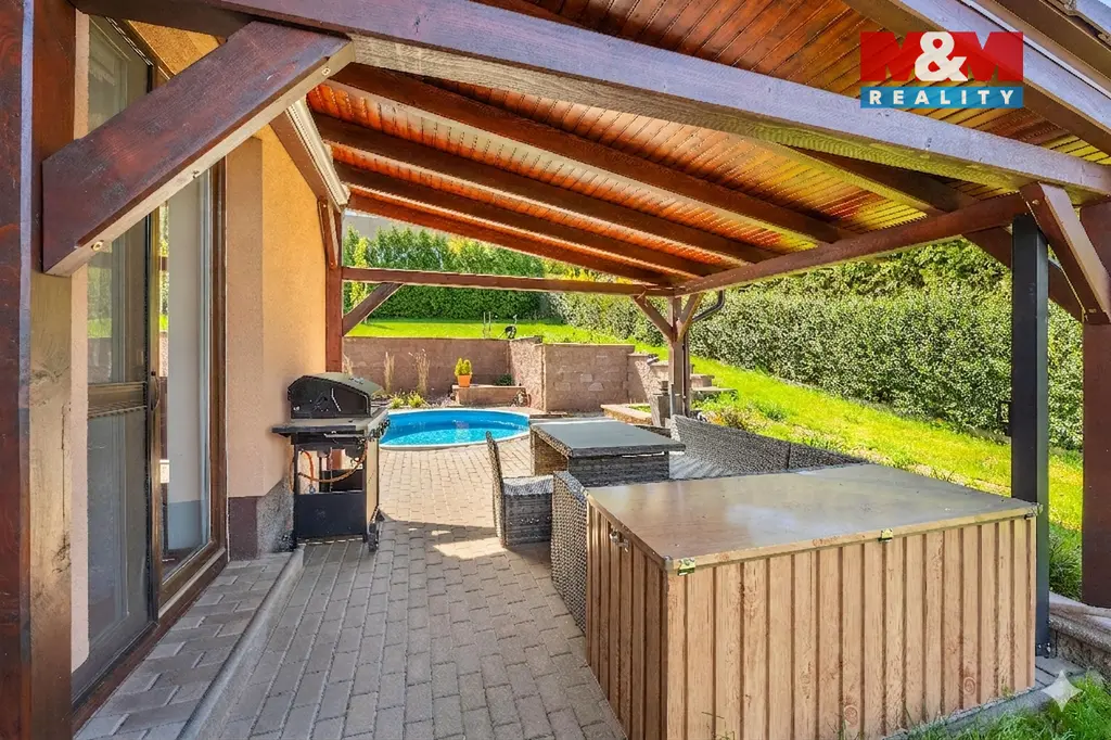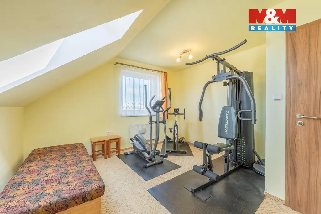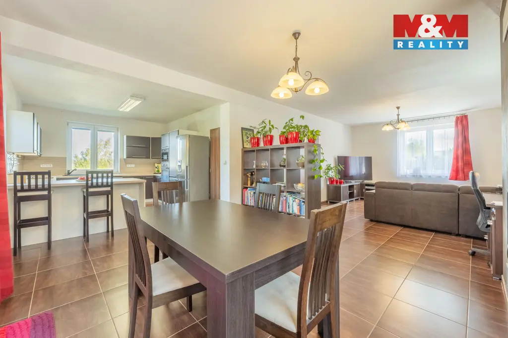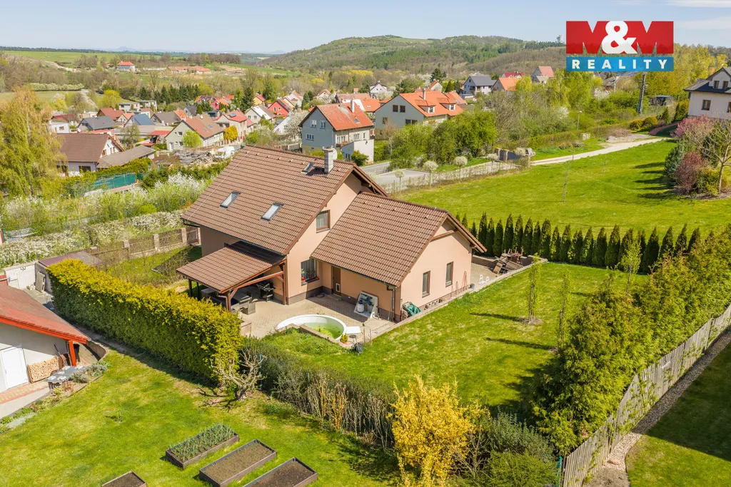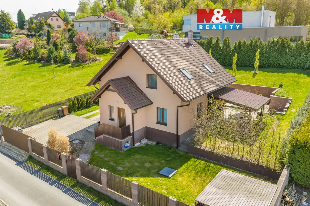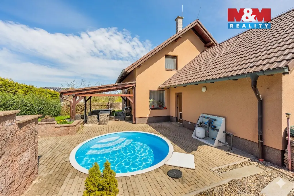 Hledáte oázu klidu pro svou rodinu? Nabízíme Vám rodinný dům v Libušíně, situovaný ve velmi klidné ulici na pozemku o rozloze 918 m². Nemovitost je vzdálena pouhých 5 minut vozem od Kladna a 20 minut od Prahy. Srdcem domu je prosvětlené přízemí, kde najdete velkou kuchyni plynule propojenou s jídelnou, pracovnou a obývacím pokojem. Tento otevřený prostor (70 m²) působí velmi vzdušně, přičemž hřejivou atmosféru dodává krbová vložka. Součástí přízemí je rovněž koupelna s WC a sprchovým koutem. V případě potřeby lze přízemí snadno upravit na dispozici 2+1. V patře (66 m²) se nachází ložnice, posilovna, dětský pokoj a koupelna s vanou a WC. Celková užitná plocha domu činí 136 m² (až 5+1). Dům je vytápěn úsporným tepelným čerpadlem vzduch-voda. K dispozici je dostatek úložných prostor díky dvěma půdám (24 m² v domě a 36 m² nad garáží). Na zahradě vás potěší bazén, posezení pod pergolou a prostorná dvougaráž (36 m²). Nemovitost je možné hradit hypo úvěrem s jehož vyřízením Vám rádi pomůžeme