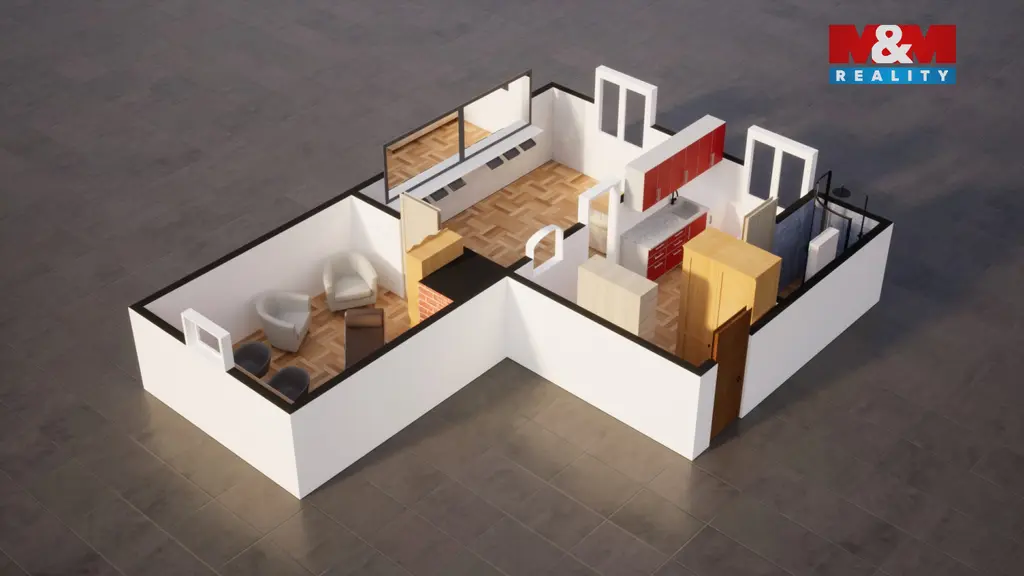 Obývací pokoj, praktická kuchyně, další pokoj a samozřejmě koupelna se sprchovým koutem. Na chodbě poté naleznete místnost, kde se z bývalé koupelny dá vytvořit technické zázemí, například na umístění pračky a sušičky.