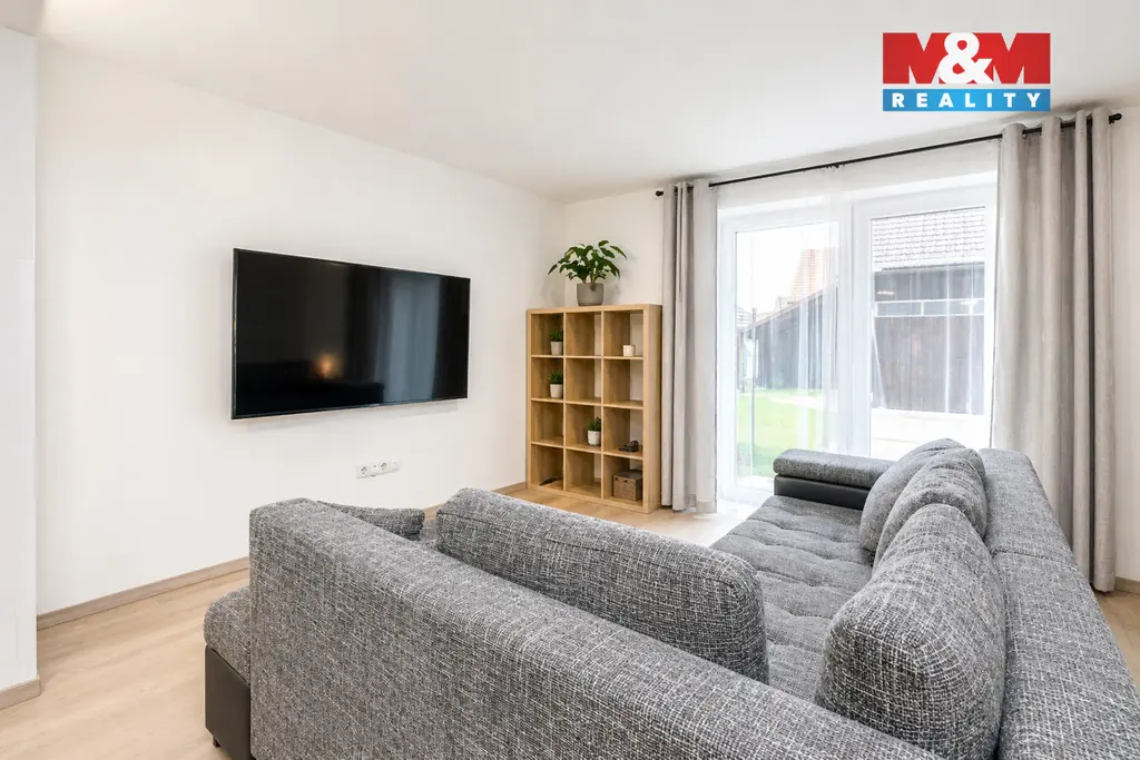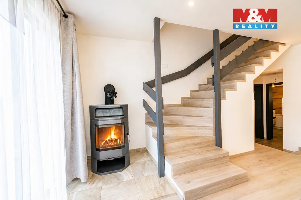 Dominantou je světlý obývací pokoj s krbem, ze kterého je přímý vstup na terasu a navazující zahradu. Je vedená jako společná, avšak její užívání je prakticky rozděleno tak, že tato část domu má svou jasně vymezenou soukromou zónu.