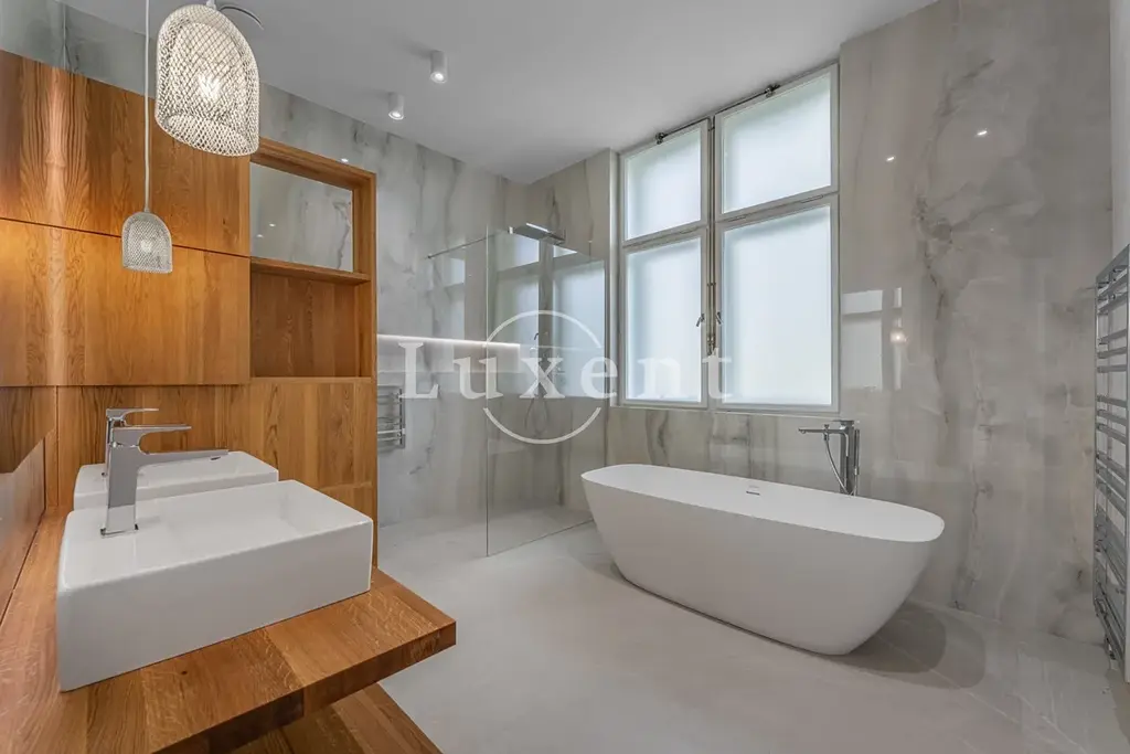 Interiér přízemí, které představuje srdce celého domu, vás přivítá velkolepou vstupní halou s původním vyřezávaným schodištěm. Další dominantou je prostorný jídelní a obývací pokoj plynule navazující na salón, kancelář a zimní zahradu. Z rozlehlé terasy, která je přístupná z haly, obývacího pokoje a kuchyně, vede dvouramenné schodiště přímo do zahrady. Na tomto podlaží dále naleznete šatnu a toaletu. Dispozice prvního patra nabízí klidovou zónu se třemi ložnicemi, dvěma luxusními koupelnami, balkonem, stylovými vestavěnými šatnami a hernou. V podkroví se nachází kuchyně, dvě koupelny, čtyři místnosti, šatny a sklady. Spolu se suterénem, který disponuje samostatným vstupem ze zahrady a prostory pro vinotéku či technické zázemí, nabízejí tato dvě podlaží prostor pro individuální dotvoření dle vašich osobních preferencí – ať už plánujte wellness, kanceláře nebo byt pro hosty či ostrahu.