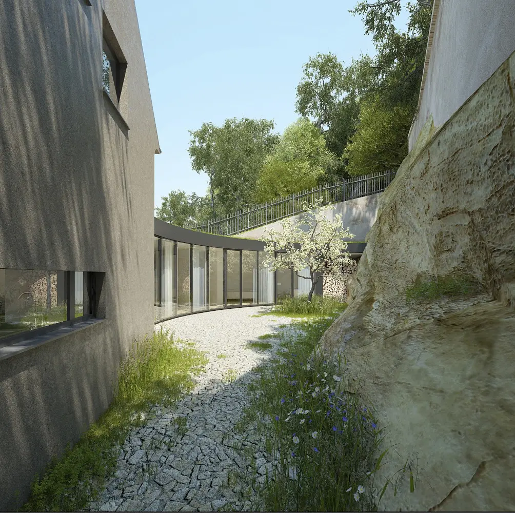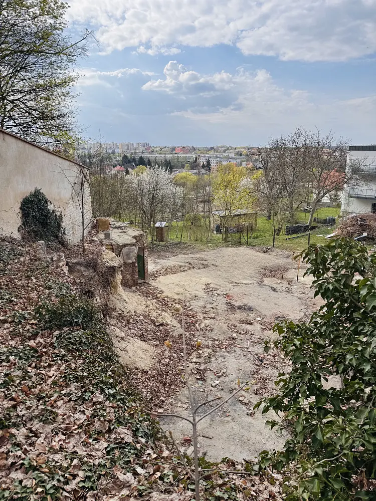 Ukryté schodiště pod vysokými lípami s nenápadným vstupem do obory. Na východní straně živo, prudká zatáčka, zastávka autobusu, kostel, dotek města…směrem na západ klid, mírná svažitá louka a sad padající podél zdi obory údolím Litovického potoka k nově zbudovanému rybníku Terezka.25