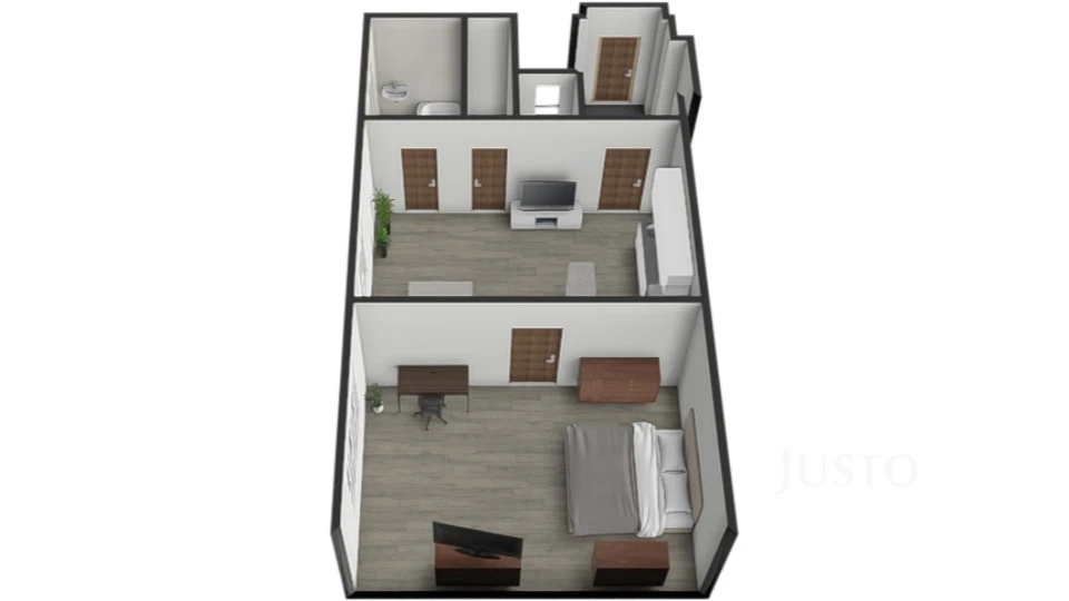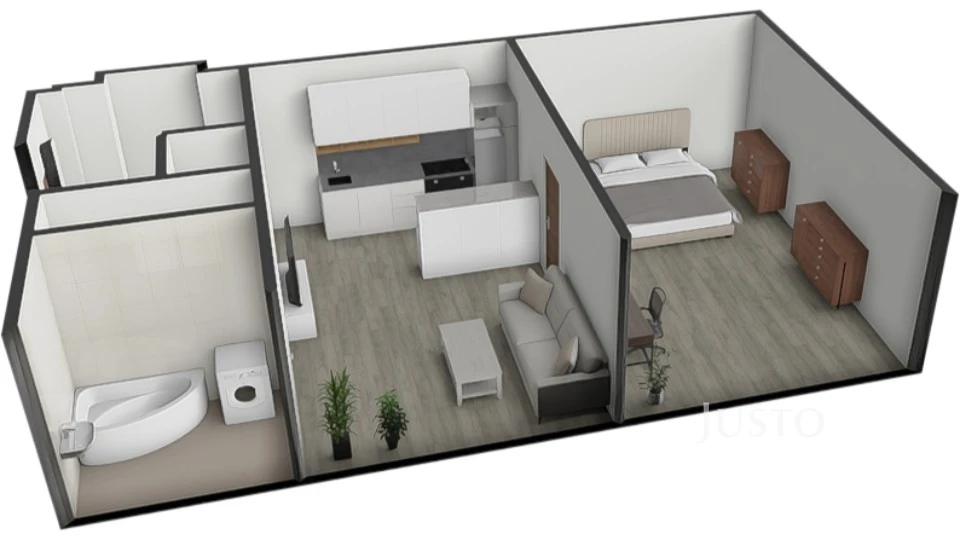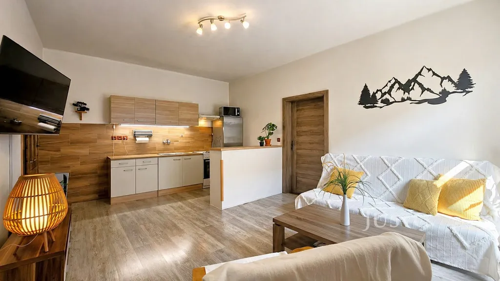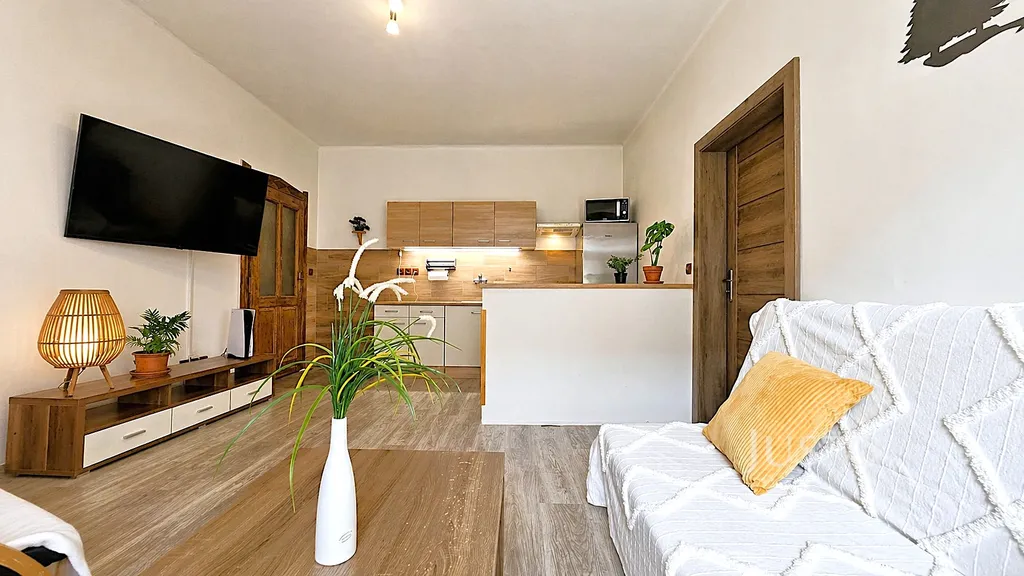 Hlavní obytnou část tvoří obývací pokoj s kuchyňským koutem. Z této místnosti je vstup do koupelny s vanou a prostorem pro pračku. Příjemným detailem je okno z koupelny orientované do ulice, které zajišťuje přirozené světlo i větrání.