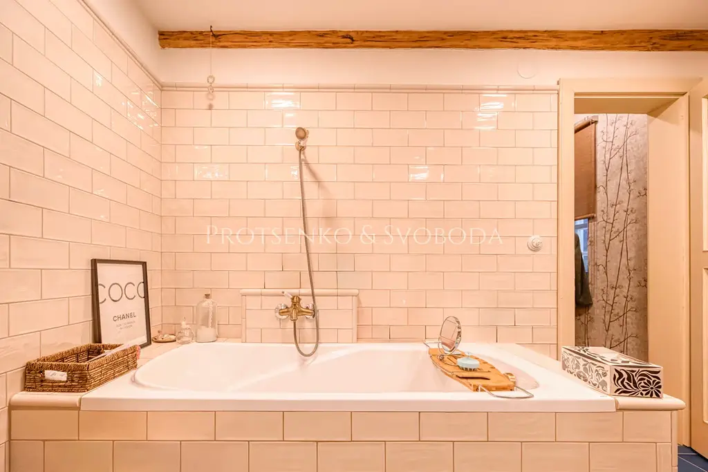 Zachované původní trámy, masivní dřevo, přirozené materiály, ruční detaily a světlo, které prostupuje každým koutem. Interiér je promyšlený do posledního detailu – propojuje historický charakter s komfortem moderního bydlení.