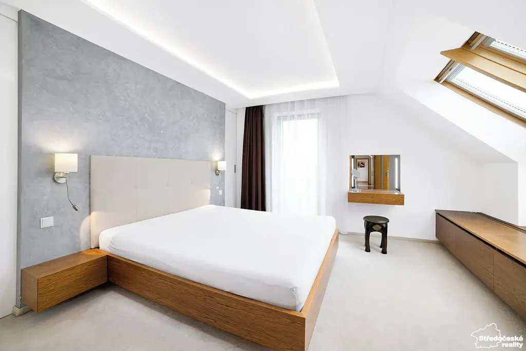 Po dřevěných schodech se dostanete do patra, kde jsou tři samostatné pokoje a dvě koupelny. Ložnice je na míru se zadní šatnou, ve spojovací chodbě jsou po celé délce vestavěné skříně. Dětský pokoj je zajímavě řešený do čela domu a je krásně prosvětlený. Poslední pokoj je kreativní dílna, případně pokoj pro hosty, nebo může sloužit jako druhý dětský pokoj.