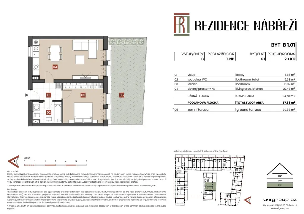 Nabízíme k prodeji byt 2+kk v Brandýse nad Labem-Staré Boleslavi. Tento byt se nachází v exkluzivní lokalitě ostrova v klidné části obce a je součástí projektu Rezidence Nábřeží. Byt má celkovou podlahovou plochu 58 m² a je umístěn v 1. patře třípodlažního soliterního domu. Byt má severojižní orientaci s tím, že ložnice a obývací pokoj jsou orientovány na jih, kuchyňský kout s oknem pak na sever. K bytu náleží soukromá předzahrádka na jižní straně.