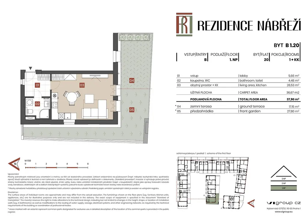 Netradičně řešený byt 1+kk se severo-jižní orientací obklopený předzahrádkou. Byt je situovaný ve 1. nadzemním podlaží budovy a jeho součástí je prostorný obývací pokoj s kuchyňským koutem, vstupní hala a koupelna s WC. Pamatuje se také na úložné prostory umístěné v chodbě za vstupními dveřmi. Byt je vhodný pro potřeby investičního bydlení nebo také jako bydlení pro singles.
