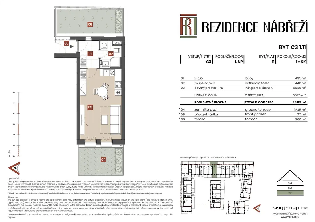 Oblíbená a prakticky řešená dispozice bytu 1+kk se východo-západní orientací. Byt je situovaný ve 1. nadzemním podlaží budovy a jeho součástí je prostorný obývací pokoj s kuchyňským koutem, vstupní hala a koupelna s WC. Pamatuje se také na úložné prostory umístěné v chodbě za vstupními dveřmi. K bytu patří v vlastní předzahrádka jak z východní strany tak i ze západní strany. Byt je vhodný pro potřeby investičního bydlení nebo také jako bydlení pro singles.
