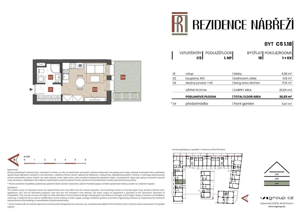 Oblíbená a prakticky řešená dispozice bytu 1+kk se severo-jižní orientací. Byt je situovaný ve 1. nadzemním podlaží budovy a jeho součástí je prostorný obývací pokoj s kuchyňským koutem, vstupní hala a koupelna s WC. Pamatuje se také na úložné prostory umístěné v chodbě za vstupními dveřmi. K bytu patří v vlastní předzahrádka. Byt je vhodný pro potřeby investičního bydlení nebo také jako bydlení pro singles.