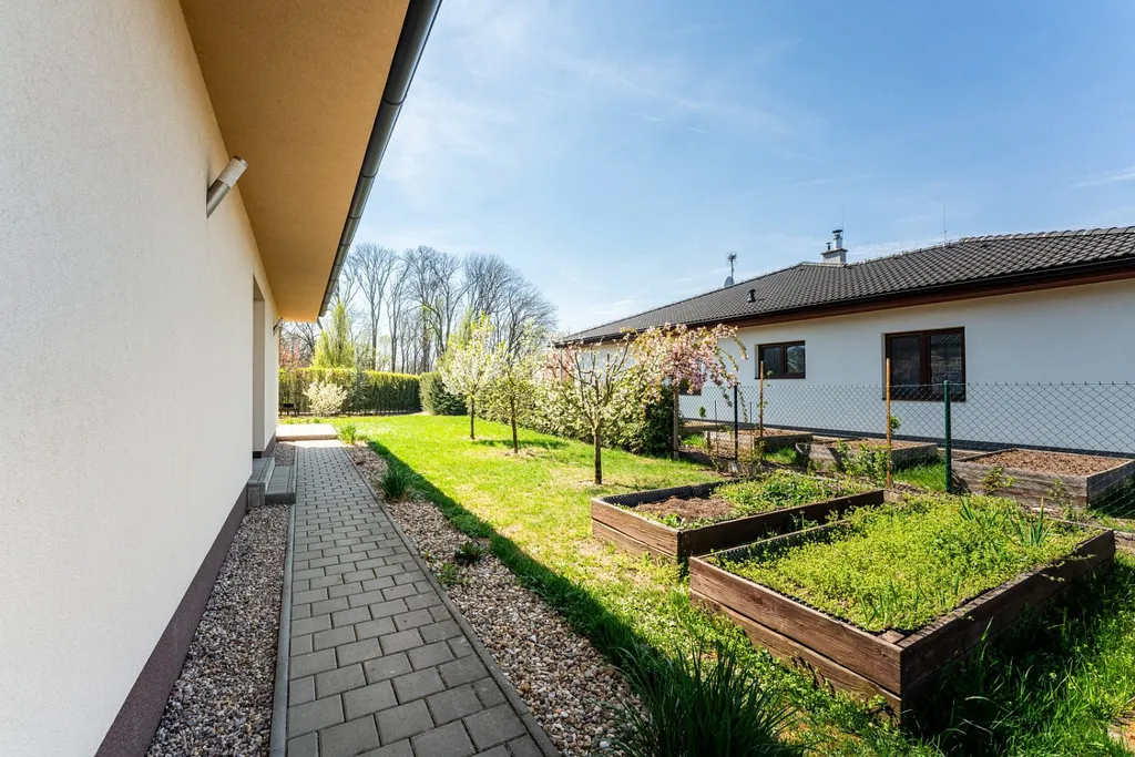 Velkou předností této nemovitosti je prostorný pozemek o výměře 919 m², který poskytuje dostatek soukromí i prostoru pro relaxaci. Zahrada je obklopena zelení a vzrostlými stromy, nabízí ideální místo pro odpočinek, zahradničení i rodinné aktivity. Nechybí ani bazén umístěný v bezprostřední blízkosti terasy.