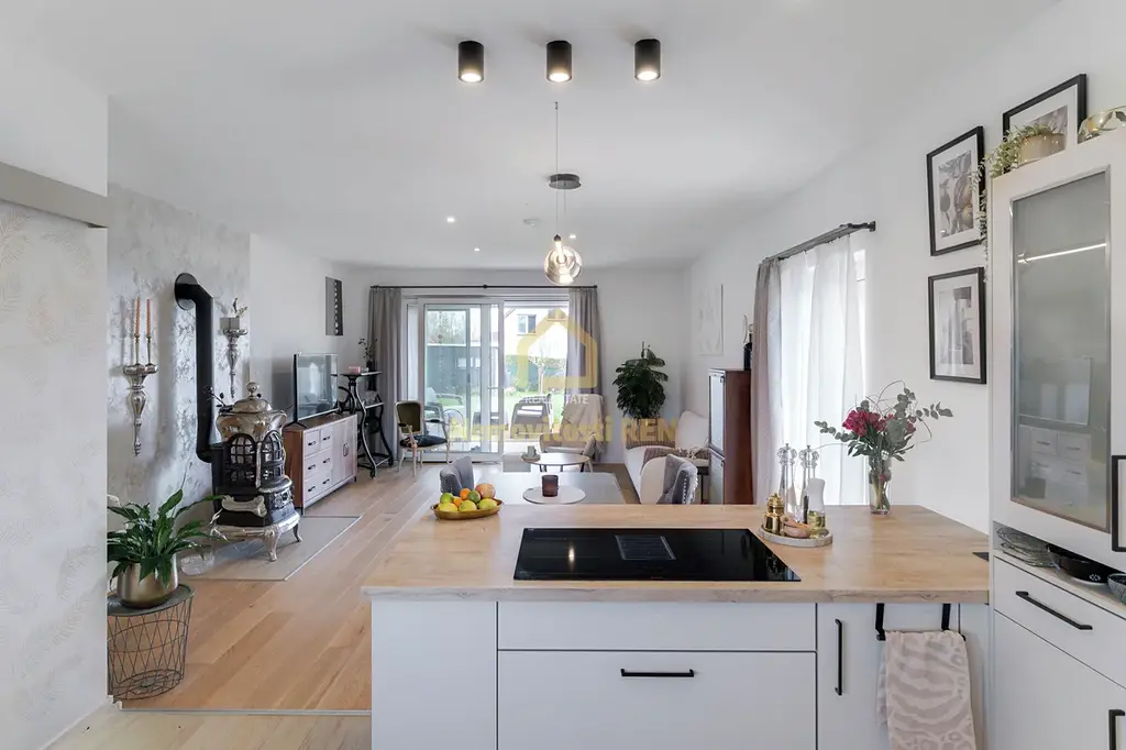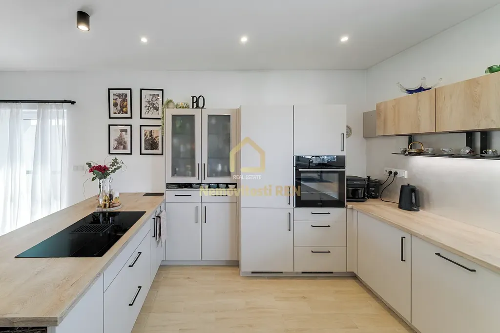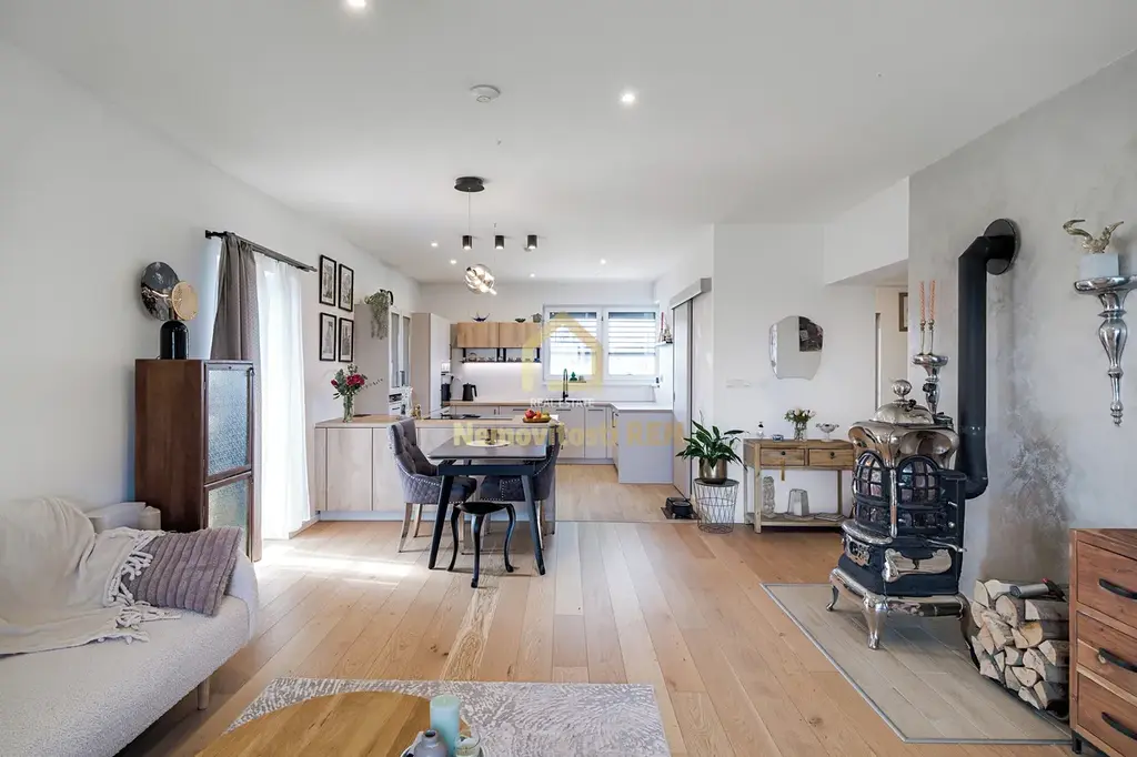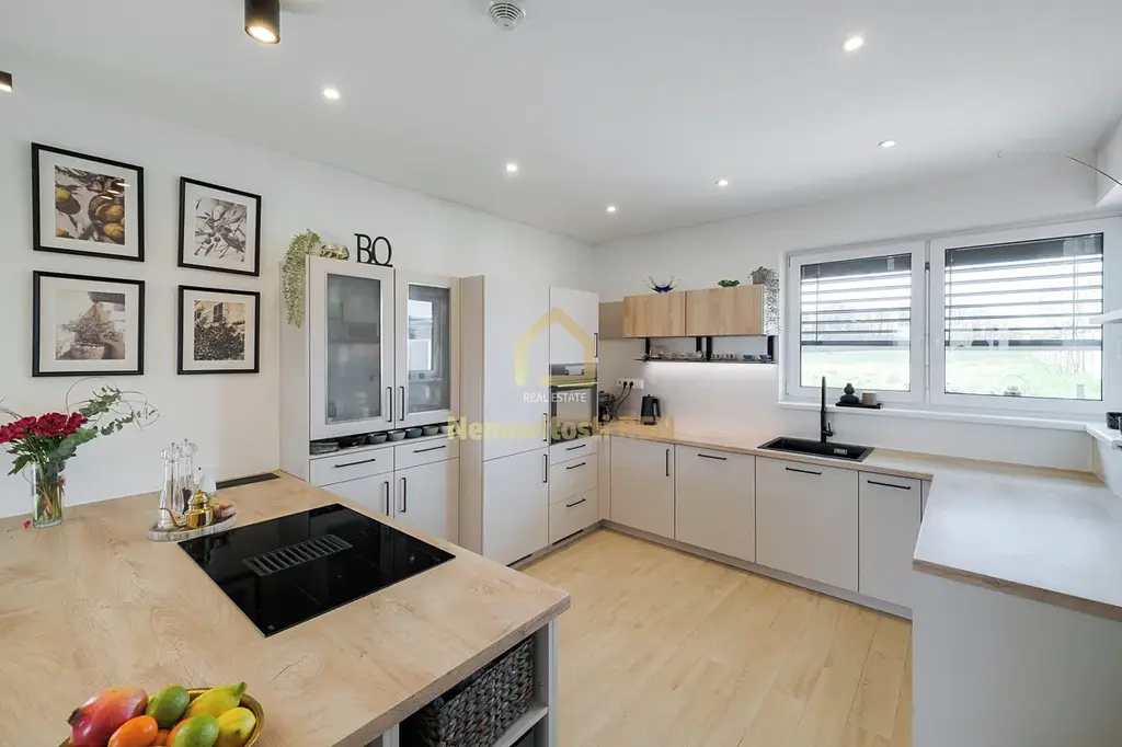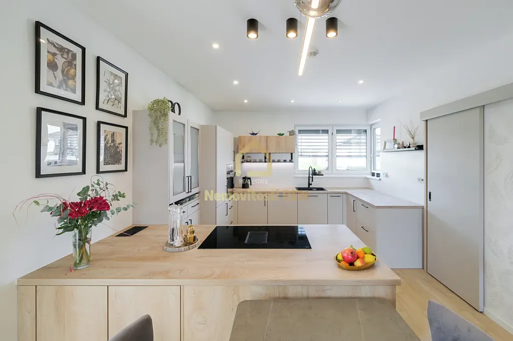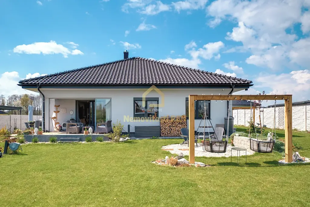 Dům stojí na slunném pozemku o rozloze 1 146 m², který poskytuje dostatek soukromí i prostoru pro relax. Srdcem domu je prostorný obývací pokoj s kuchyní, s komorou na potraviny a jídelnou. Moderní kuchyňská linka nabízí dostatek pracovního i úložného prostoru. Atmosféru dotváří stylová americká krbová kamna, která zároveň přispívají k úspornému vytápění. Z obývací části je přímý vstup na terasu, ideální pro letní posezení.