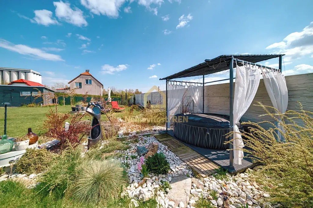 Zahrada je skutečnou oázou – vířivka, letní sprcha, ohniště, houpačka i zahradní domek. Velikost pozemku umožňuje další využití, například bazén či dětské hřiště.