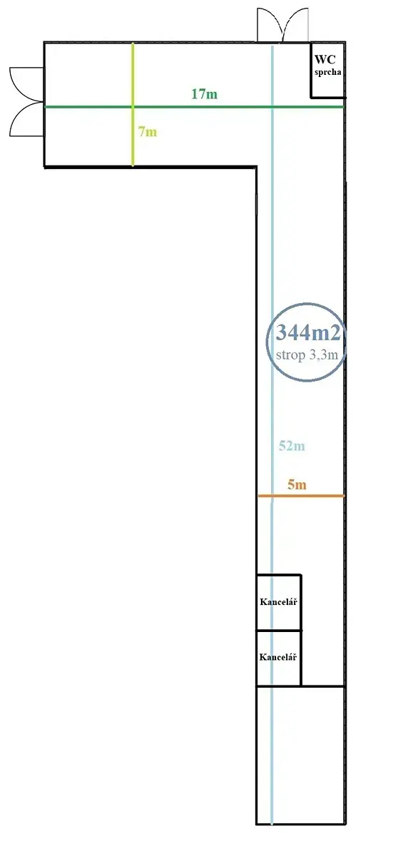 Hala může sloužit například k uskladnění materiálu, lehké výrobě atd. Výška 3,3m. Velká vrata pro vjezd nákladních aut + druhá menší boční vrata. Podlaha je kombinace zátěžové pojezdové dlažby a betonu. V hale se nachází dvě vestavěné kanceláře a koupelna s WC. Hala je nově zateplena. Prostory budou předány vyklizené.