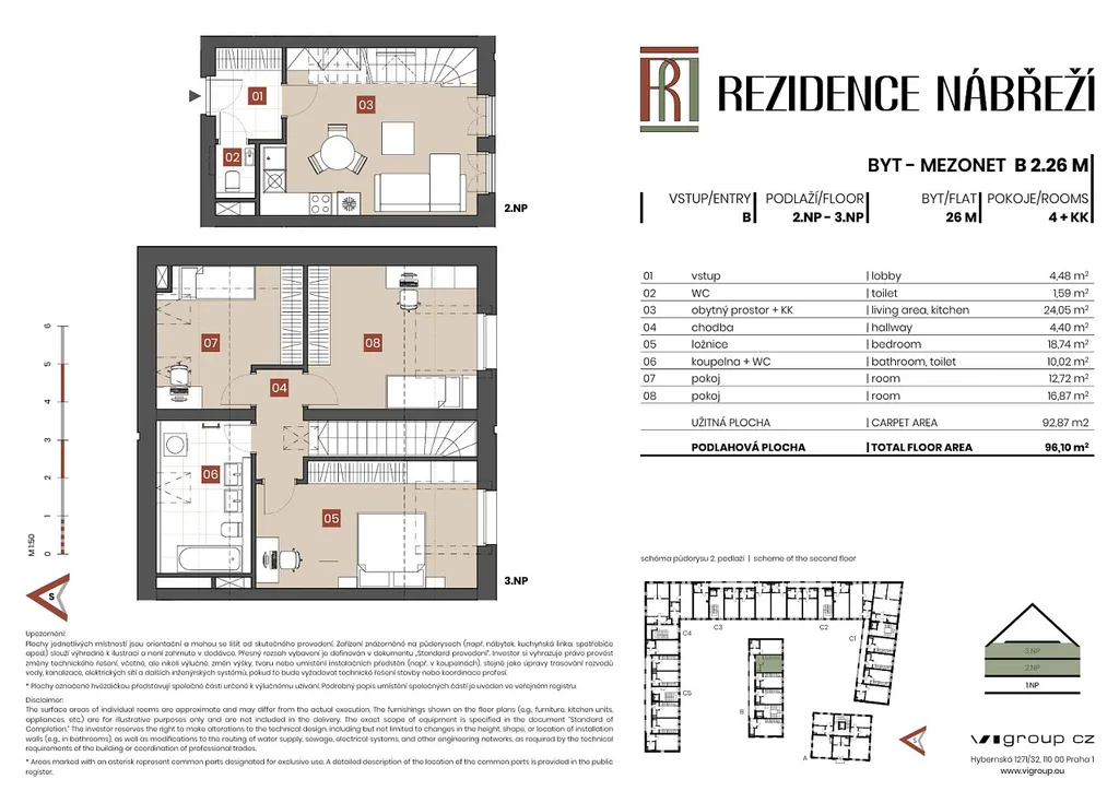 Exkluzivní mezonetový byt 4+kk v Brandýse nad Labem-Staré Boleslavi. Tento byt se nachází v netypické lokalitě ostrova v klidné části obce a je součástí projektu Rezidence Nábřeží. Byt se nachází na 2. a 3. podlaží soliterního domu B a má celkovou podlahovou plochu 96 m². Hlavní orientace bytu je v severojižním směru. Na spodním, vstupním podlaží nelezneme obývací pokoj s kuchyňským koutem, na vrchním podlaží ve 3.NP domu jsou pak po interiérovém schodišti přístupné celkem další 3 ložnice a také více jak 10m² koupelna s WC. Ta je přisvětlena přírodním světlem ze střešního okna. Kromě malé ložnice - pracovny, která má střešní okna na severní stranu tak obě další větší ložnice mají pak vikýřová okna na jižní stranu.