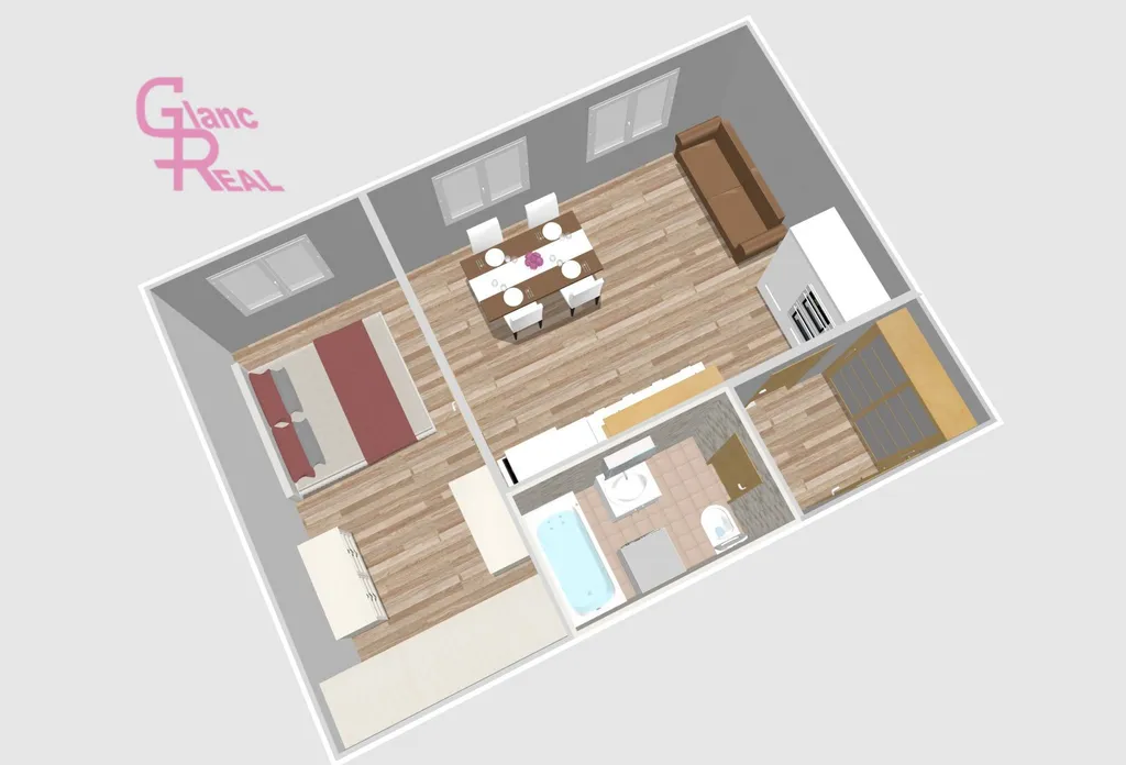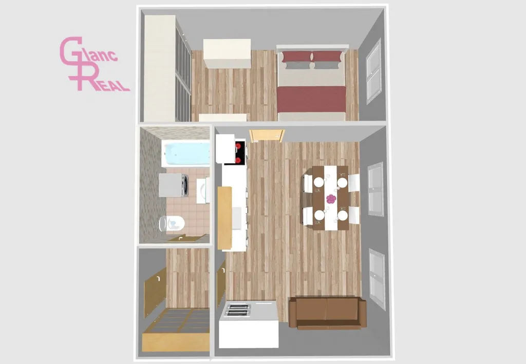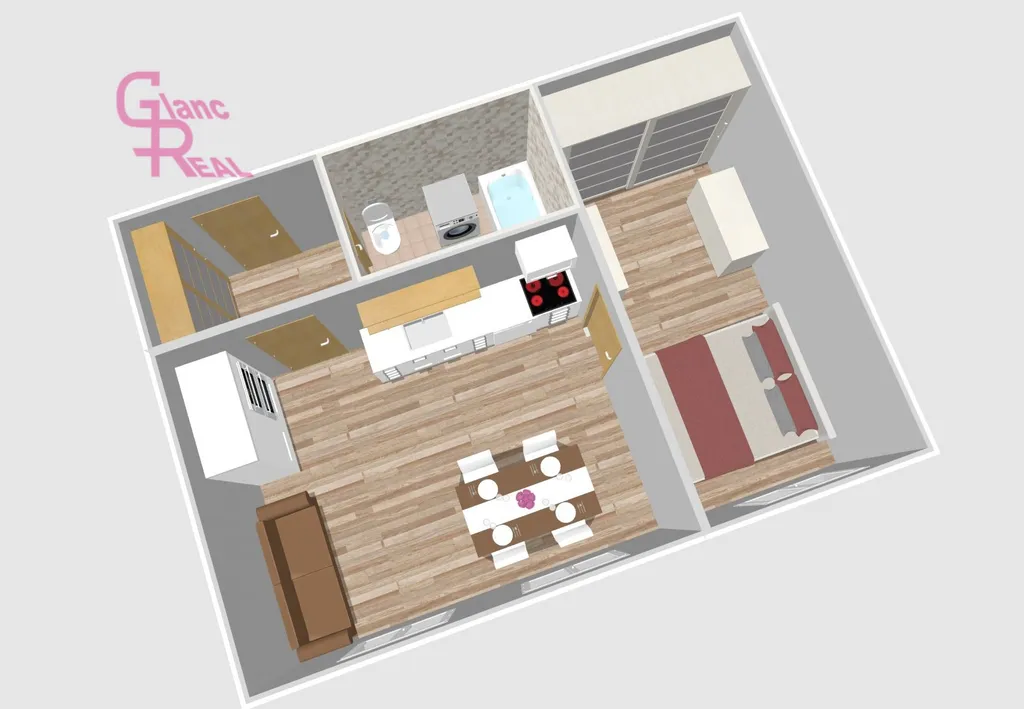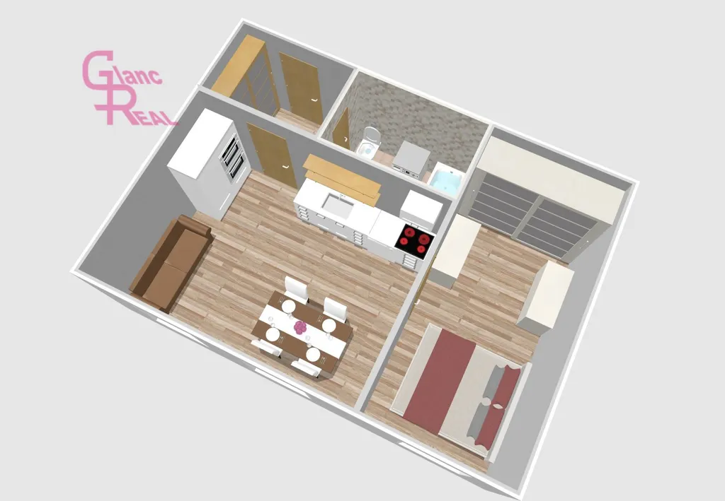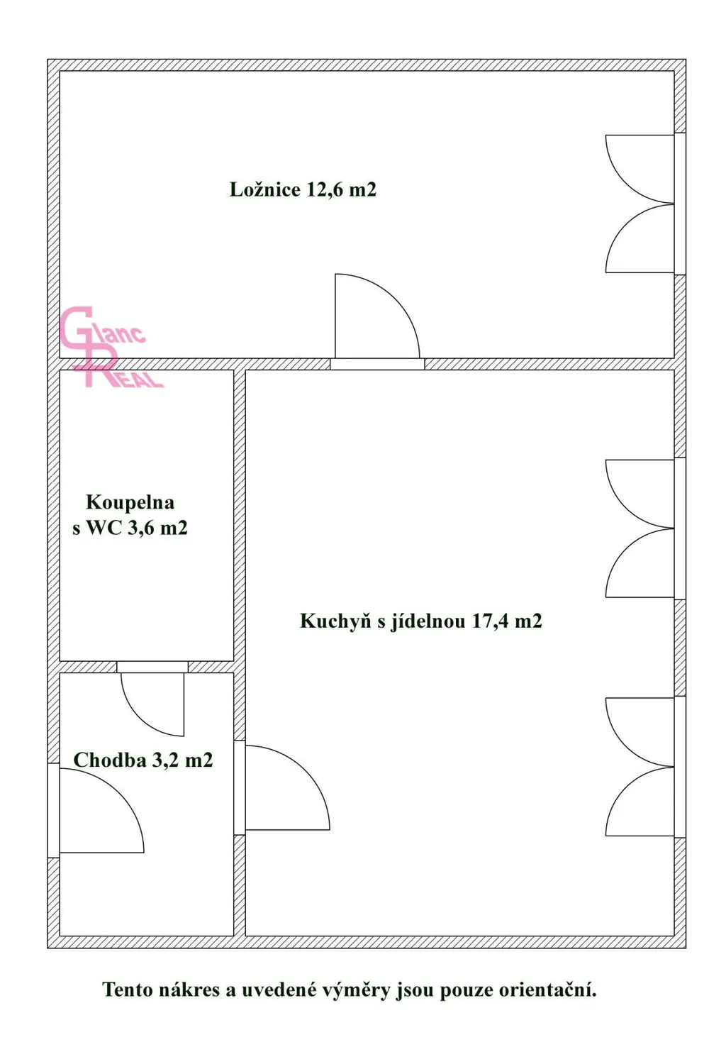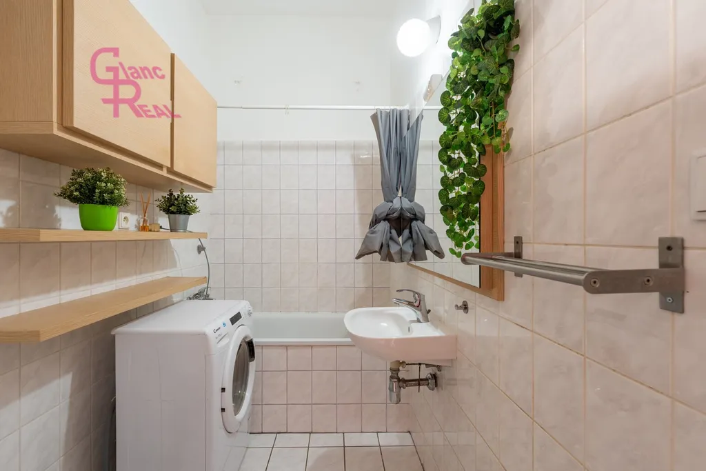 Byt disponuje praktickou a účelnou dispozicí: vstupní předsíň, koupelna s toaletou, samostatná prostorná kuchyně s místem pro jídelní kout i obývací část, KL vybavená lednicí s mrazákem, myčkou, varnou deskou, troubou a digestoří, a dále pokoj s vestavěnou skříní. Laminátová plovoucí podlaha a dlažba, což zajišťuje snadnou údržbu.